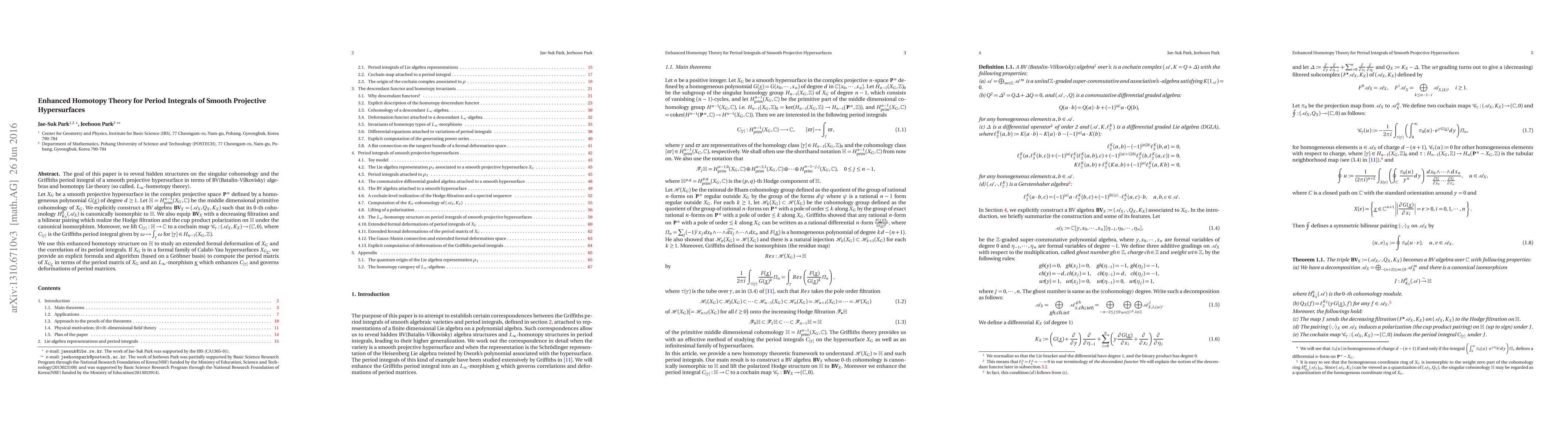 The goal of this paper is to reveal hidden structures on the singular cohomology and the Griffiths period integral of a smooth projective hypersurface in terms of BV(Batalin-Vilkovisky) algebras and homotopy Lie theory (so called, $L_\infty$-homotopy theory). Let $X_G$ be a smooth projective hypersurface in the complex projective space $\mathbf{P}^n$ defined by a homogeneous polynomial $G(\underline x)$ of degree $d \geq 1$. Let $\mathbb{H}=H^{n-1}_{\operatorname{prim}}(X_G, \mathbb{C})$ be the middle dimensional primitive cohomology of $X_G$. We explicitly construct a BV algebra $\mathbf{B\!\!V}_{\! \!X}=(\mathcal{A}_X,Q_X, K_X)$ such that its $0$-th cohomology $H^0_{K_X}(\mathcal{A}_X)$ is canonically isomorphic to $\mathbb{H}$. We also equip $\mathbf{B\!\!V}_{\! \!X}$ with a decreasing filtration and a bilinear pairing which realize the Hodge filtration and the cup product polarization on $\mathbb{H}$ under the canonical isomorphism. Moreover, we lift $C_{[\gamma]}:\mathbb{H} \to \mathbb{C}$ to a cochain map $\mathcal{C}_\gamma:(\mathcal{A}_X, K_X) \to (\mathbb{C},0)$, where $C_{[\gamma]}$ is the Griffiths period integral given by $\omega \mapsto \int_\gamma \omega$ for $[\gamma]\in H_{n-1}(X_G,\mathbb{Z})$. We use this enhanced homotopy structure on $\mathbb{H}$ to study an extended formal deformation of $X_G$ and the correlation of its period integrals. If $X_G$ is in a formal family of Calabi-Yau hypersurfaces $X_{G_{\underline T}}$, we provide an explicit formula and algorithm (based on a Gr\"obner basis) to compute the period matrix of $X_{G_{\underline T}}$ in terms of the period matrix of $X_G$ and an $L_\infty$-morphism $\underline \kappa$ which enhances $C_{[\gamma]}$ and governs deformations of period matrices.