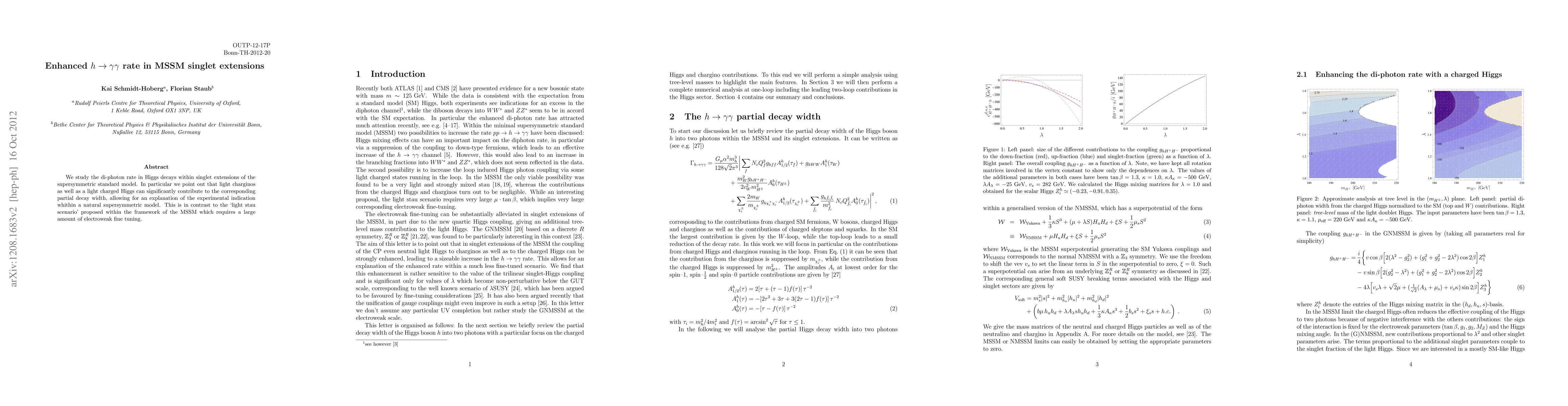 We study the di-photon rate in Higgs decays within singlet extensions of the supersymmetric standard model. In particular we point out that light charginos as well as a light charged Higgs can significantly contribute to the corresponding partial decay width, allowing for an explanation of the experimental indication whithin a natural supersymmetric model. This is in contrast to the `light stau scenario' proposed within the framework of the MSSM which requires a large amount of electroweak fine tuning.