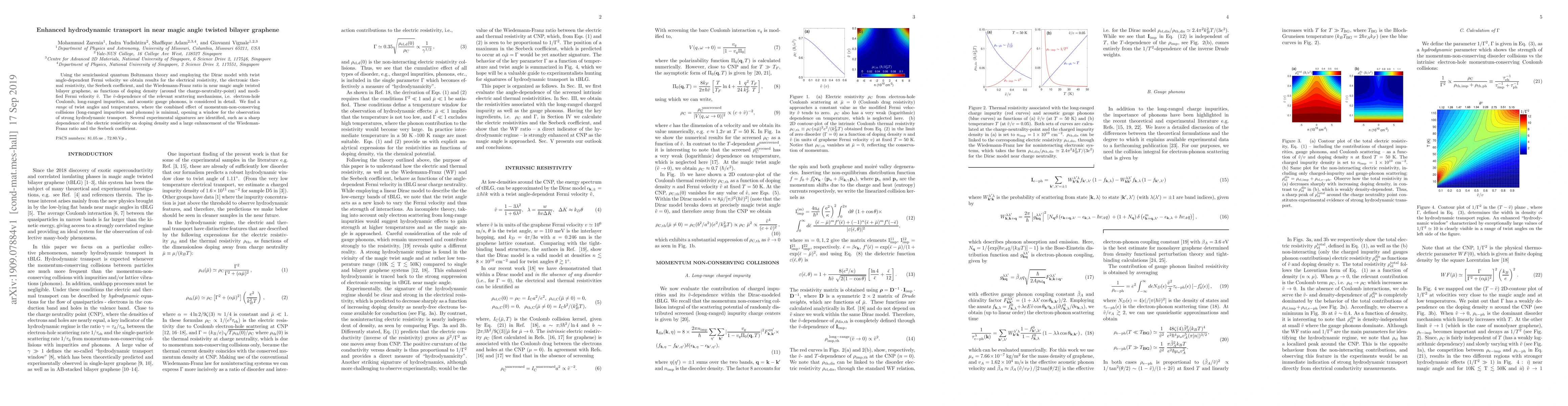 This paper investigates the electrical and thermal transport properties in near magic angle twisted bilayer graphene, identifying conditions under which hydrodynamic transport can be strongly observed. The study finds minimal impact of momentum-non-conserving collisions at certain angles and temperatures, leading to significant enhancements in the Wiedemann-Franz ratio, Seebeck coefficient, and resistivity dependence on doping.