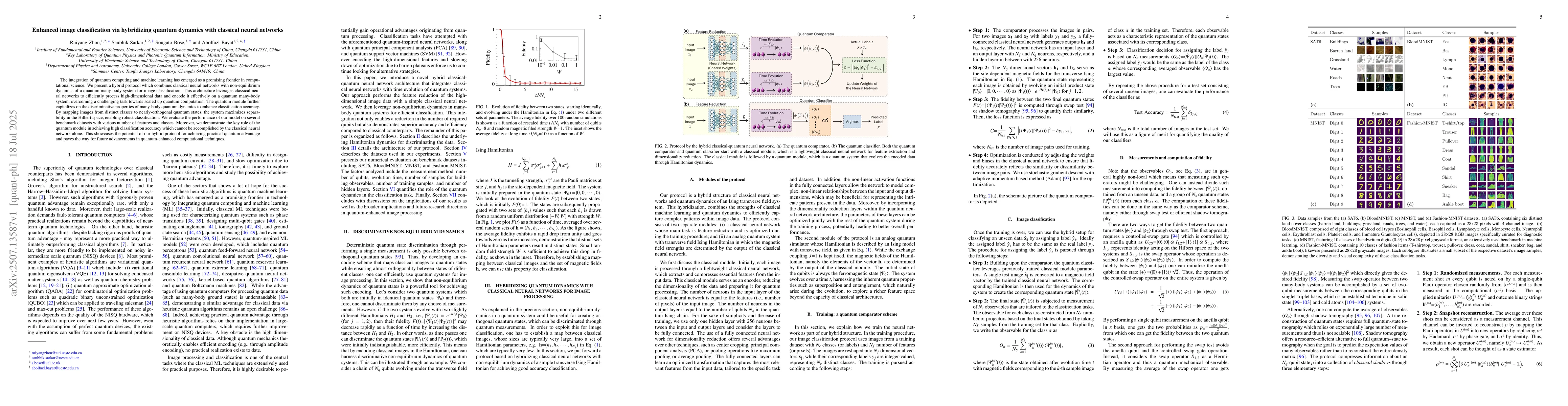 The integration of quantum computing and machine learning has emerged as a promising frontier in computational science. We present a hybrid protocol which combines classical neural networks with non-equilibrium dynamics of a quantum many-body system for image classification. This architecture leverages classical neural networks to efficiently process high-dimensional data and encode it effectively on a quantum many-body system, overcoming a challenging task towards scaled up quantum computation. The quantum module further capitalizes on the discriminative properties of many-body quantum dynamics to enhance classification accuracy. By mapping images from distinct classes to nearly-orthogonal quantum states, the system maximizes separability in the Hilbert space, enabling robust classification. We evaluate the performance of our model on several benchmark datasets with various number of features and classes. Moreover, we demonstrate the key role of the quantum module in achieving high classification accuracy which cannot be accomplished by the classical neural network alone. This showcases the potential of our hybrid protocol for achieving practical quantum advantage and paves the way for future advancements in quantum-enhanced computational techniques.