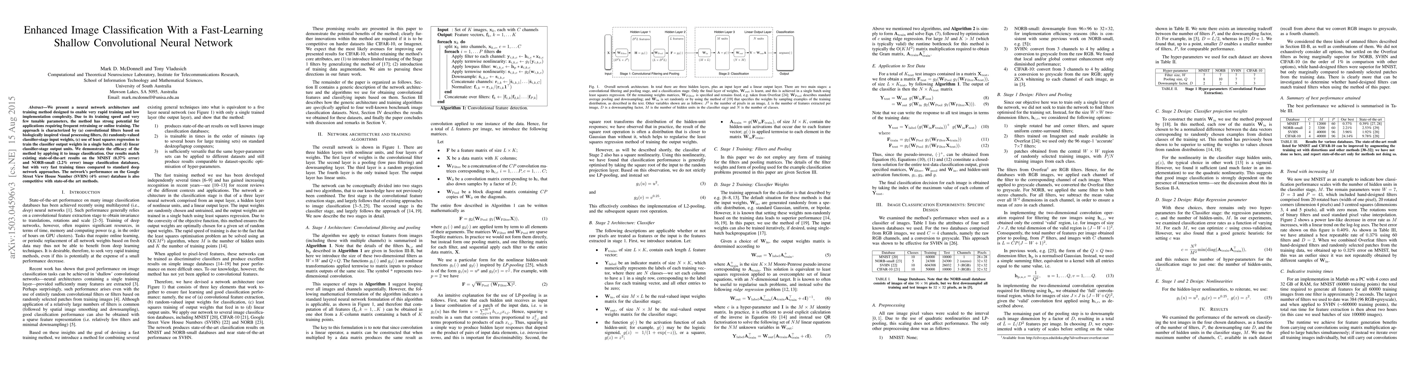 We present a neural network architecture and training method designed to enable very rapid training and low implementation complexity. Due to its training speed and very few tunable parameters, the method has strong potential for applications requiring frequent retraining or online training. The approach is characterized by (a) convolutional filters based on biologically inspired visual processing filters, (b) randomly-valued classifier-stage input weights, (c) use of least squares regression to train the classifier output weights in a single batch, and (d) linear classifier-stage output units. We demonstrate the efficacy of the method by applying it to image classification. Our results match existing state-of-the-art results on the MNIST (0.37% error) and NORB-small (2.2% error) image classification databases, but with very fast training times compared to standard deep network approaches. The network's performance on the Google Street View House Number (SVHN) (4% error) database is also competitive with state-of-the art methods.