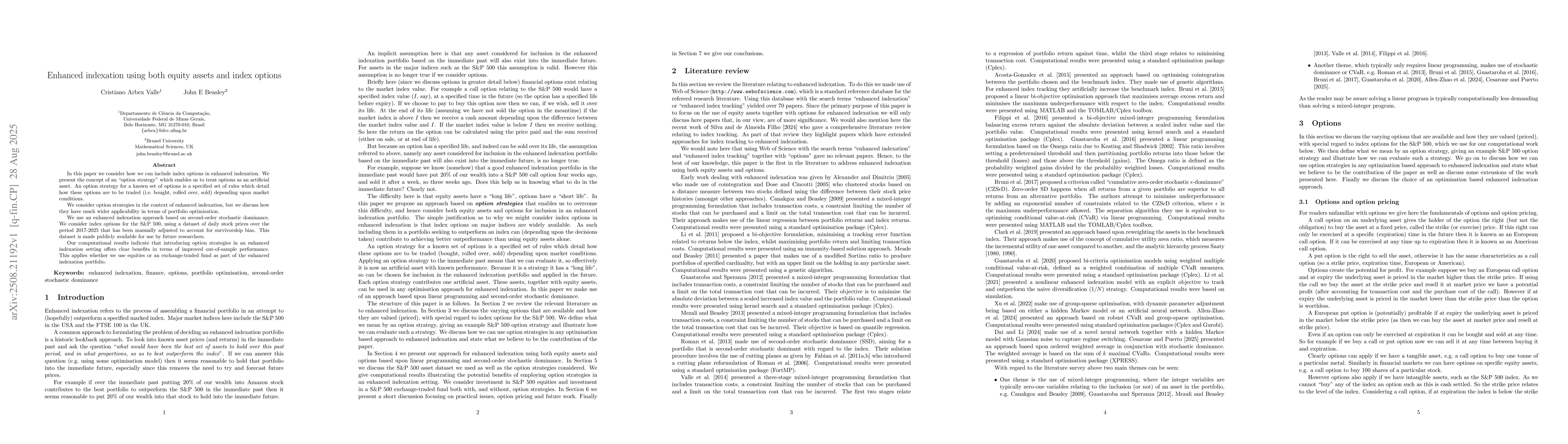 In this paper we consider how we can include index options in enhanced indexation. We present the concept of an \enquote{option strategy} which enables us to treat options as an artificial asset. An option strategy for a known set of options is a specified set of rules which detail how these options are to be traded (i.e.~bought, rolled over, sold) depending upon market conditions. We consider option strategies in the context of enhanced indexation, but we discuss how they have much wider applicability in terms of portfolio optimisation. We use an enhanced indexation approach based on second-order stochastic dominance. We consider index options for the S\&P~500, using a dataset of daily stock prices over the period 2017-2025 that has been manually adjusted to account for survivorship bias. This dataset is made publicly available for use by future researchers. Our computational results indicate that introducing option strategies in an enhanced indexation setting offers clear benefits in terms of improved out-of-sample performance. This applies whether we use equities or an exchange-traded fund as part of the enhanced indexation portfolio.