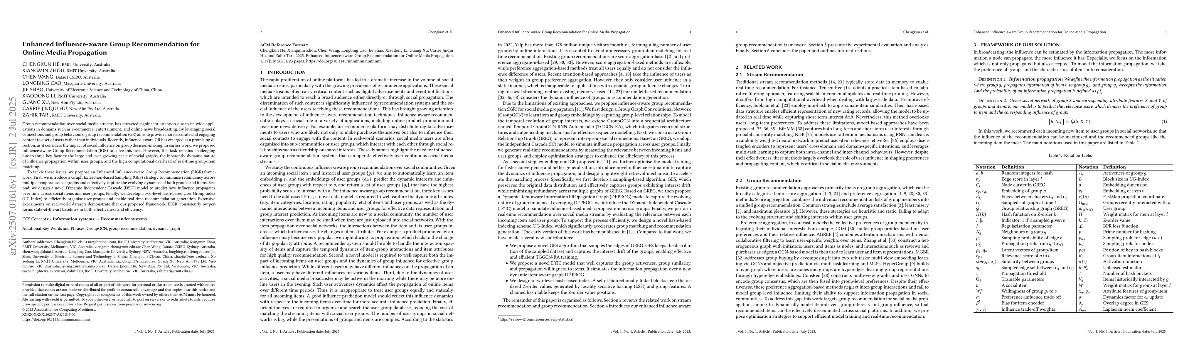 The paper introduces Enhanced Influence-aware Group Recommendation (EIGR) for online media propagation, addressing challenges in group recommendation on social media. EIGR employs Graph Extraction-based Sampling (GES) to minimize redundancy in social graphs, Dynamic Independent Cascade (DYIC) to predict influence propagation, and a two-level hash-based User Group Index (UG-Index) for efficient real-time recommendations. Experiments show EIGR outperforms existing methods in both effectiveness and efficiency.