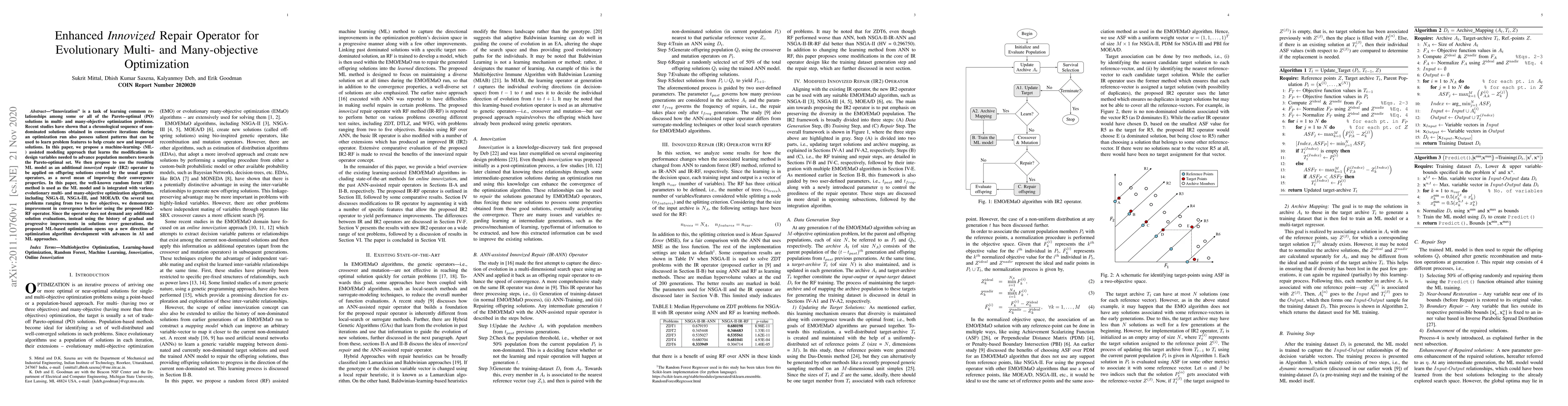 "Innovization" is a task of learning common relationships among some or all of the Pareto-optimal (PO) solutions in multi- and many-objective optimization problems. Recent studies have shown that a chronological sequence of non-dominated solutions obtained in consecutive iterations during an optimization run also possess salient patterns that can be used to learn problem features to help create new and improved solutions. In this paper, we propose a machine-learning- (ML-) assisted modelling approach that learns the modifications in design variables needed to advance population members towards the Pareto-optimal set. We then propose to use the resulting ML model as an additional innovized repair (IR2) operator to be applied on offspring solutions created by the usual genetic operators, as a novel mean of improving their convergence properties. In this paper, the well-known random forest (RF) method is used as the ML model and is integrated with various evolutionary multi- and many-objective optimization algorithms, including NSGA-II, NSGA-III, and MOEA/D. On several test problems ranging from two to five objectives, we demonstrate improvement in convergence behaviour using the proposed IR2-RF operator. Since the operator does not demand any additional solution evaluations, instead using the history of gradual and progressive improvements in solutions over generations, the proposed ML-based optimization opens up a new direction of optimization algorithm development with advances in AI and ML approaches.