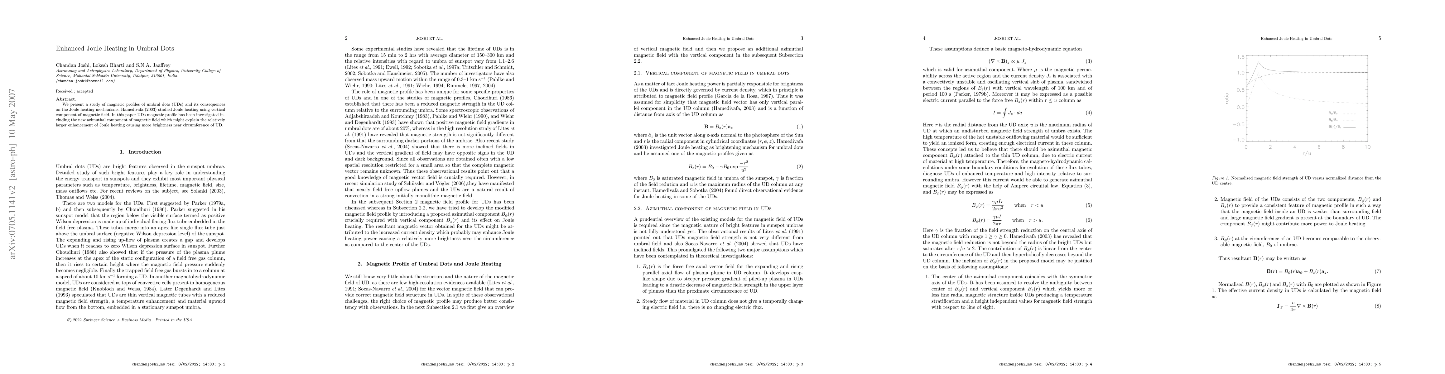 We present a study of magnetic profiles of umbral dots (UDs) and its consequences on the Joule heating mechanisms. Hamedivafa (2003) studied Joule heating using vertical component of magnetic field. In this paper UDs magnetic profile has been investigated including the new azimuthal component of magnetic field which might explain the relatively larger enhancement of Joule heating causing more brightness near circumference of UD.
