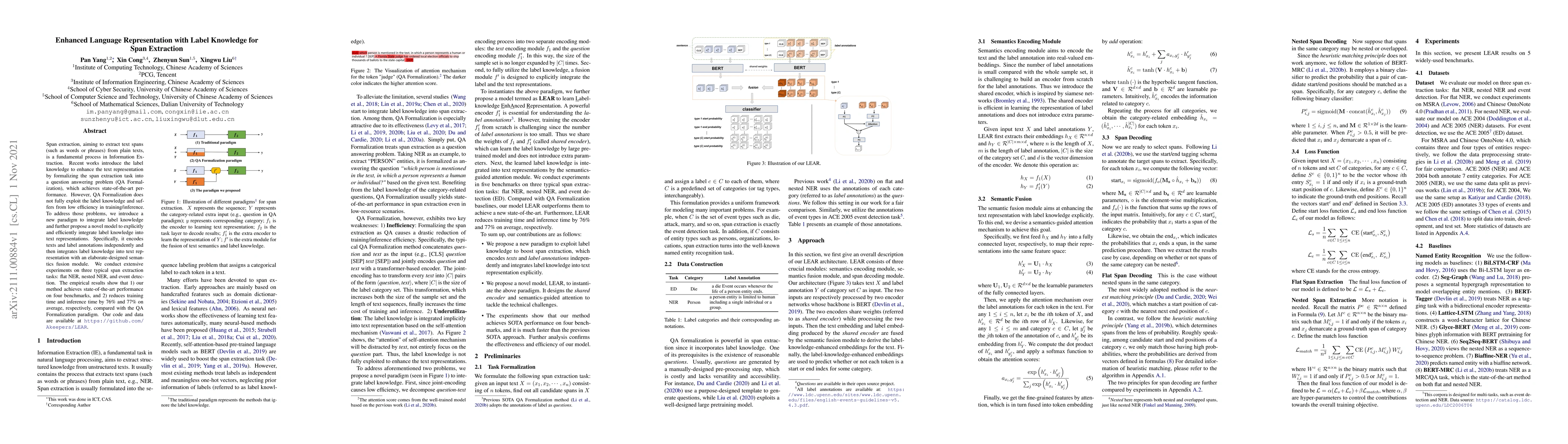 This paper proposes a new paradigm to enhance language representation by integrating label knowledge for span extraction, achieving state-of-the-art performance and significantly reducing training and inference times compared to existing methods. The model encodes text and label annotations separately and employs a semantics fusion module for efficient integration.