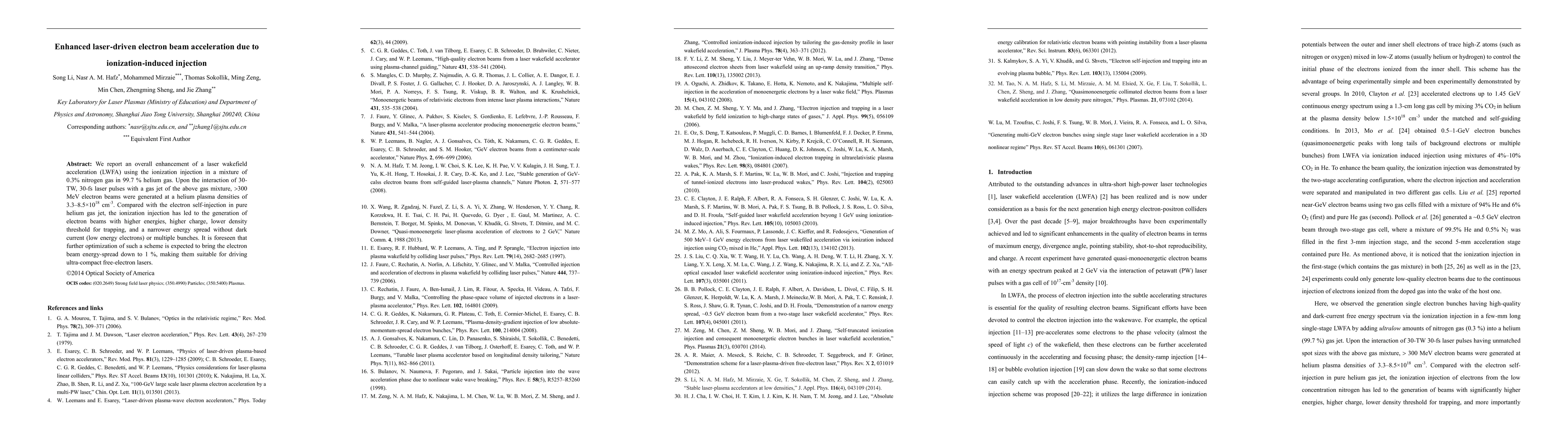 We report an overall enhancement of a laser wakefield acceleration (LWFA) using the ionization injection in a mixture of 0.3 % nitrogen gas in 99.7 % helium gas. Upon the interaction of 30 TW, 30 fs laser pulses with a gas jet of the above gas mixture, > 300 MeV electron beams were generated at a helium plasma densities of 3.3-8.5*10^18 cm^{-3}. Compared with the electron self-injection in pure helium gas jet, the ionization injection has led to the generation of electron beams with higher energies, higher charge, lower density threshold for trapping, and a narrower energy spread without dark current (low energy electrons) or multiple bunches. It is foreseen that further optimization of such a scheme is expected to bring the electron beam energy-spread down to 1 %, making them suitable for driving ultra-compact free-electron lasers