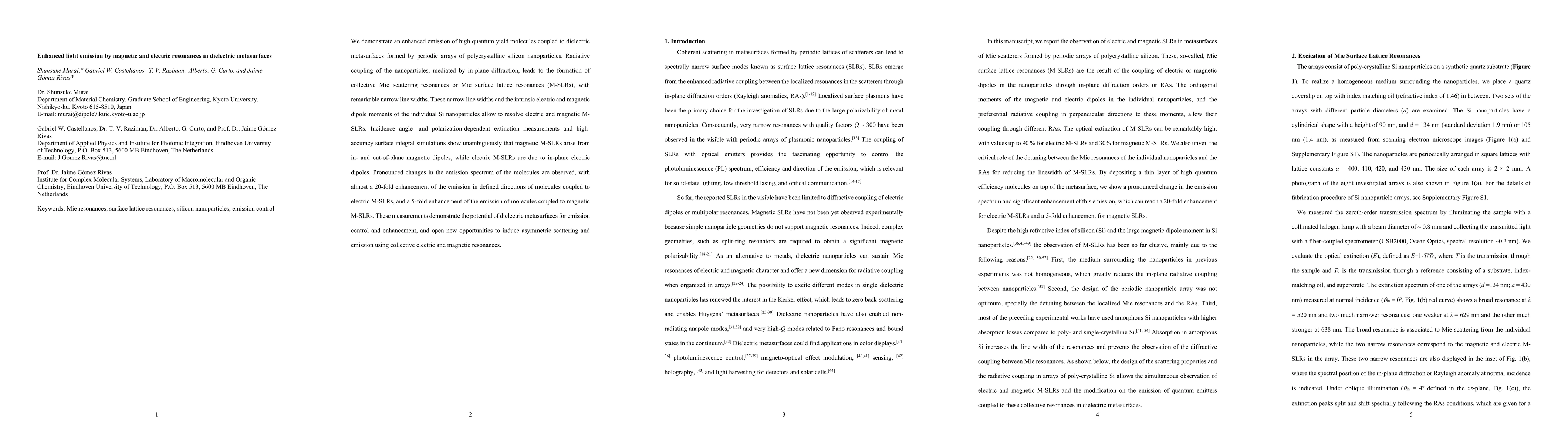 This paper demonstrates enhanced light emission from high quantum yield molecules coupled with dielectric metasurfaces composed of silicon nanoparticles, showing a 20-fold enhancement linked to electric Mie surface lattice resonances and a 5-fold enhancement linked to magnetic Mie surface lattice resonances. The study reveals distinct electric and magnetic dipole contributions to these resonances.