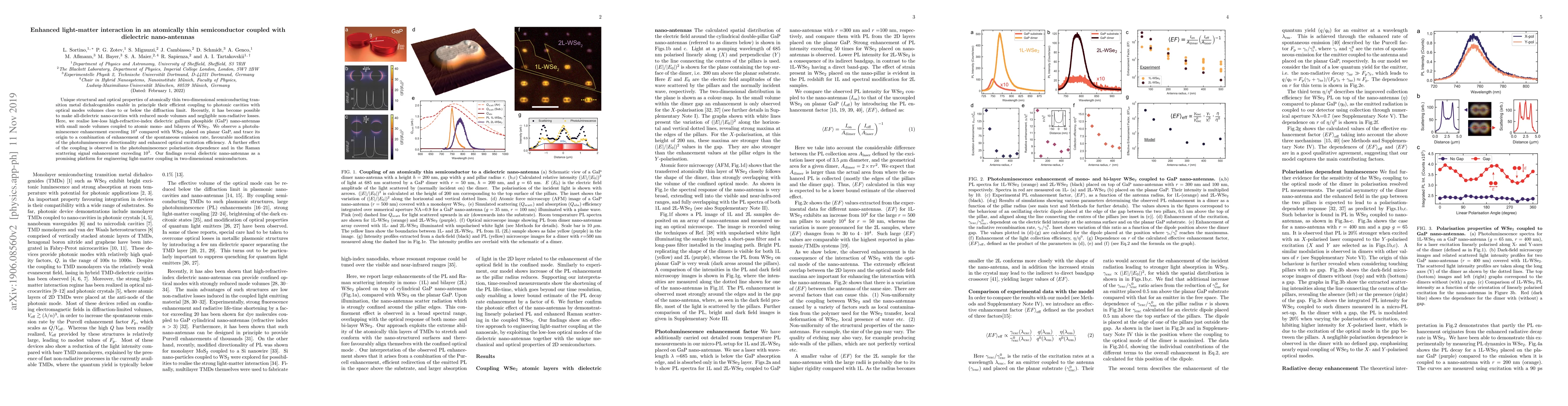 Unique structural and optical properties of atomically thin two-dimensional semiconducting transition metal dichalcogenides enable in principle their efficient coupling to photonic cavities with optical modes volumes close to or below the diffraction limit. Recently, it has become possible to make all-dielectric nano-cavities with reduced mode volumes and negligible non-radiative losses. Here, we realise low-loss high-refractive-index dielectric gallium phosphide (GaP) nano-antennas with small mode volumes coupled to atomic mono- and bilayers of WSe$_2$. We observe a photoluminescence enhancement exceeding 10$^4$ compared with WSe$_2$ placed on planar GaP, and trace its origin to a combination of enhancement of the spontaneous emission rate, favourable modification of the photoluminescence directionality and enhanced optical excitation efficiency. A further effect of the coupling is observed in the photoluminescence polarisation dependence and in the Raman scattering signal enhancement exceeding 10$^3$. Our findings reveal dielectric nano-antennas as a promising platform for engineering light-matter coupling in two-dimensional semiconductors.