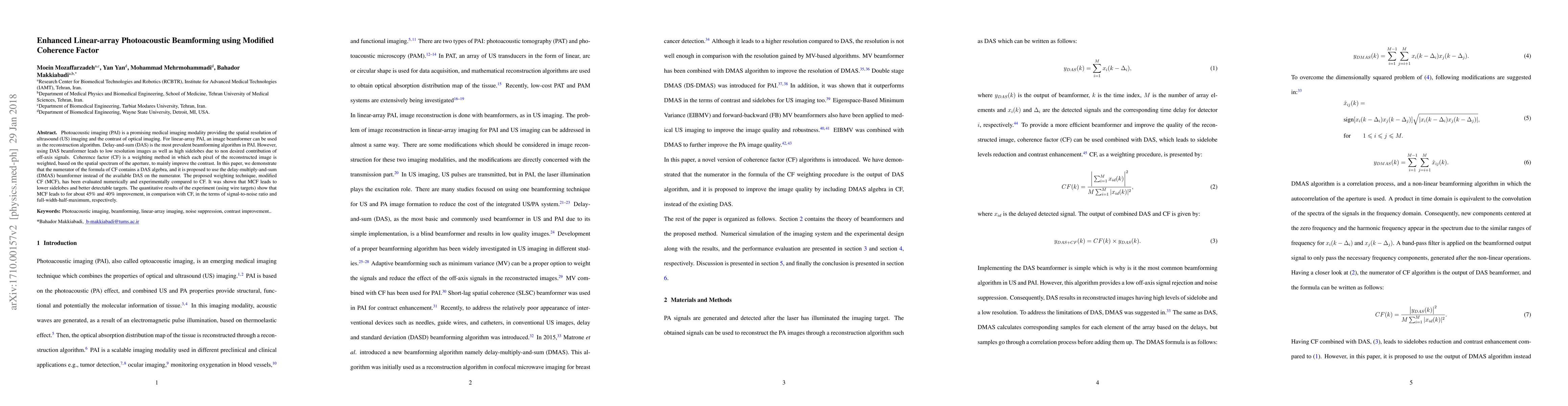 This paper proposes a modified coherence factor (MCF) for enhanced linear-array photoacoustic beamforming, replacing the traditional delay-and-sum (DAS) with delay-multiply-and-sum (DMAS) to improve resolution and reduce sidelobes. Experimental results show MCF provides a 45% improvement in signal-to-noise ratio and a 40% improvement in full-width-half-maximum compared to the standard coherence factor.