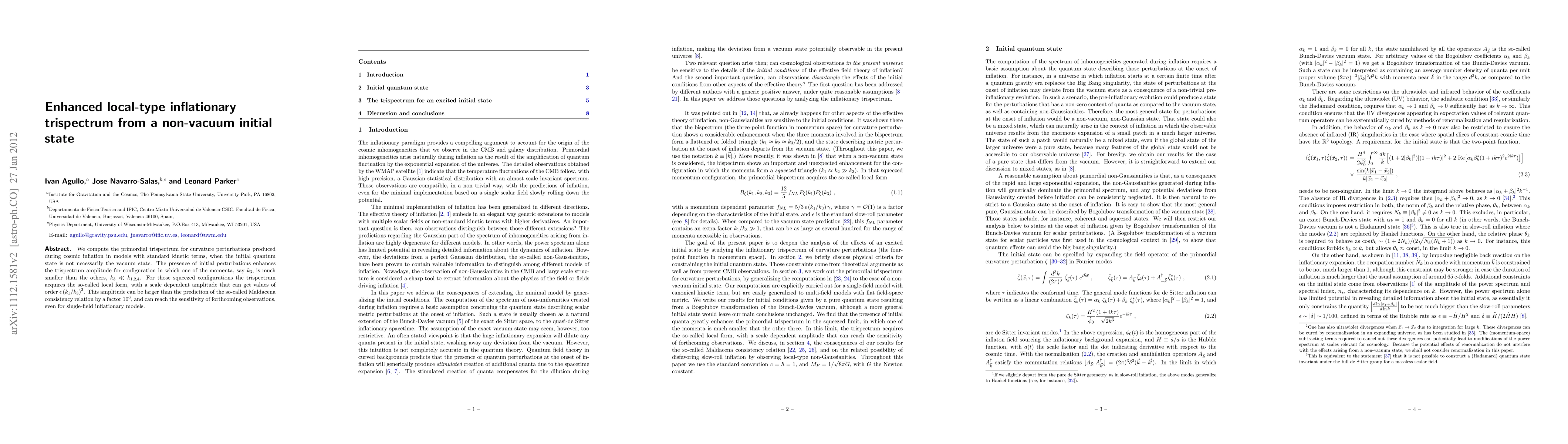 This paper investigates the primordial trispectrum from cosmic inflation when the initial quantum state is not the vacuum, finding that initial perturbations significantly enhance the trispectrum amplitude for squeezed configurations. This enhancement can exceed the predictions of the Maldacena consistency relation by a factor of $10^6$, potentially reaching the sensitivity of future observational tests.