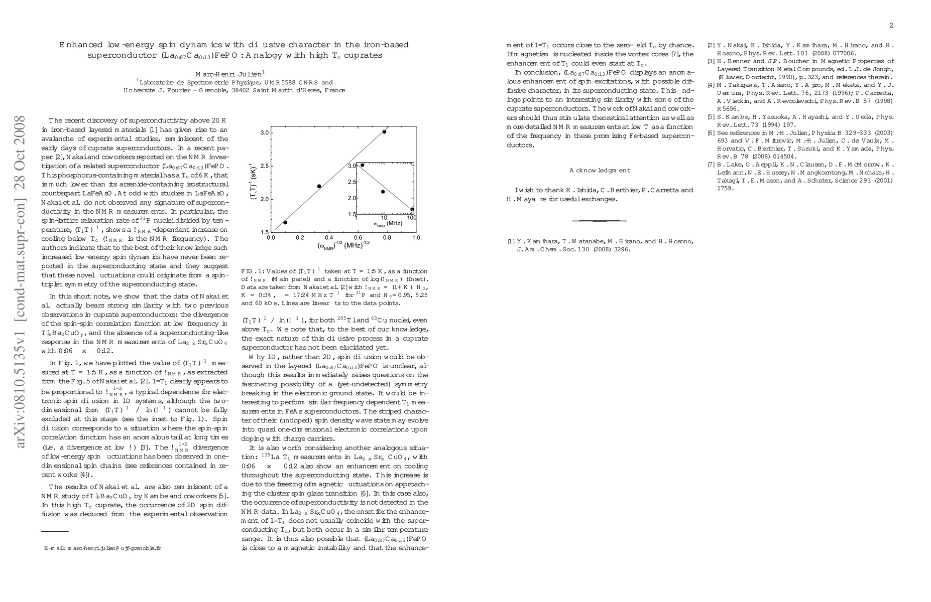 In a recent NMR investigation of the iron-based superconductor (La0.87Ca0.13)FePO [Phys. Rev. Lett. 101, 077006 (2008)] Y. Nakai et al. reported an anomalous behavior of the nuclear spin-lattice relaxation of 31P nuclei in the superconducting state: The relaxation rate 1/T1 strongly depends on the measurement frequency and its T dependence does not show the typical decrease expected for the superconducting state. In this short note, we point out that these two observations bear similarity with the situation is some of the high Tc cuprates.