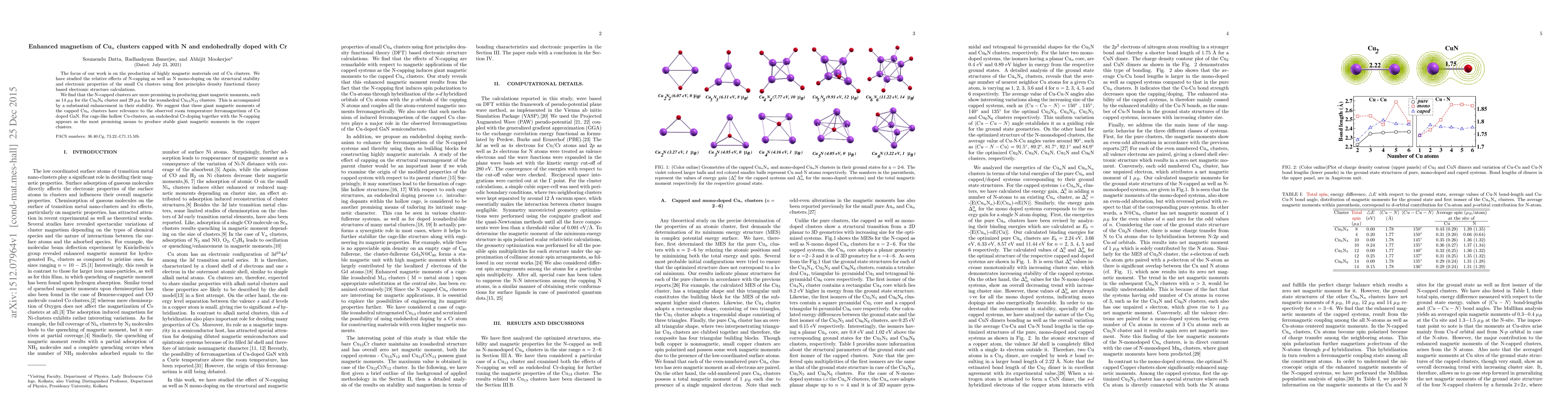 This study investigates the magnetic properties of Cu$_n$ clusters capped with nitrogen and endohedrally doped with chromium. N-capped Cu$_n$ clusters exhibit giant magnetic moments, with notable examples being 14 $\mu_B$ for Cu$_6$N$_6$ and 29 $\mu_B$ for Cu$_{13}$N$_{12}$, suggesting potential applications in room temperature ferromagnetism.