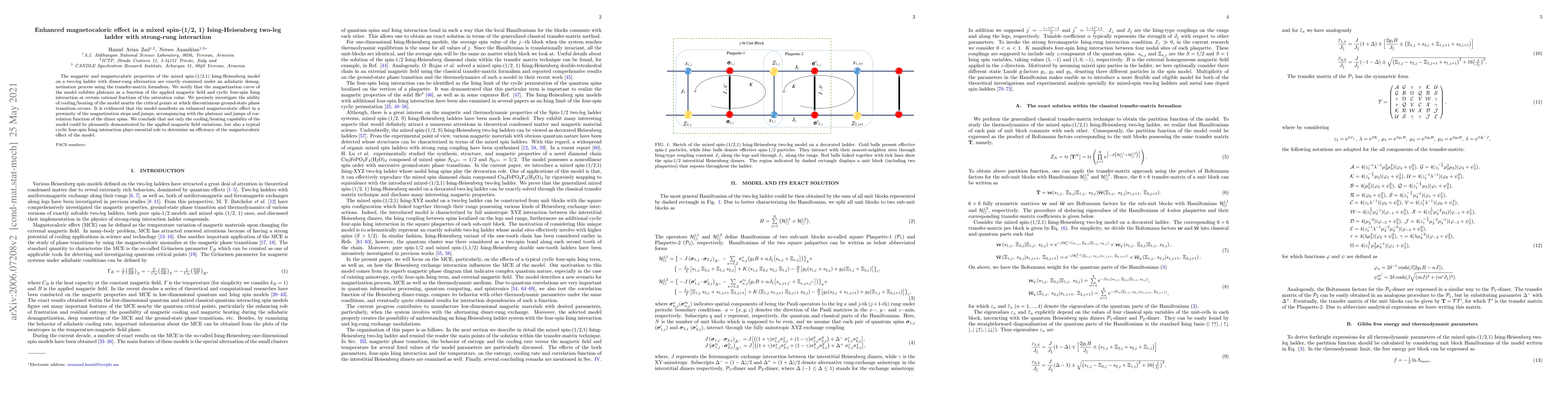 The magnetic and magnetocaloric properties of the mixed spin-(1/2,1) Ising-Heisenberg model on a two-leg ladder with dimer-rung alternation are exactly examined under an adiabatic demagnetization process using the transfer-matrix formalism. We notify that the magnetization curve of the model exhibits plateaux as a function of the applied magnetic field and cyclic four-spin Ising interaction at certain rational fractions of the saturation value. We precisely investigate the ability of cooling/heating of the model nearby the critical points at which discontinuous ground-state phase transition occurs. It is evidenced that the model manifests an enhanced magnetocaloric effect in a proximity of the magnetization steps and jumps, accompanying with the plateaux and jumps of correlation function of the dimer spins. We conclude that not only the cooling/heating capability of the model could be pleasantly demonstrated by the applied magnetic field variations, but also a typical cyclic four-spin Ising interaction plays essential role to determine an efficiency of the magnetocaloric effect of the model.
