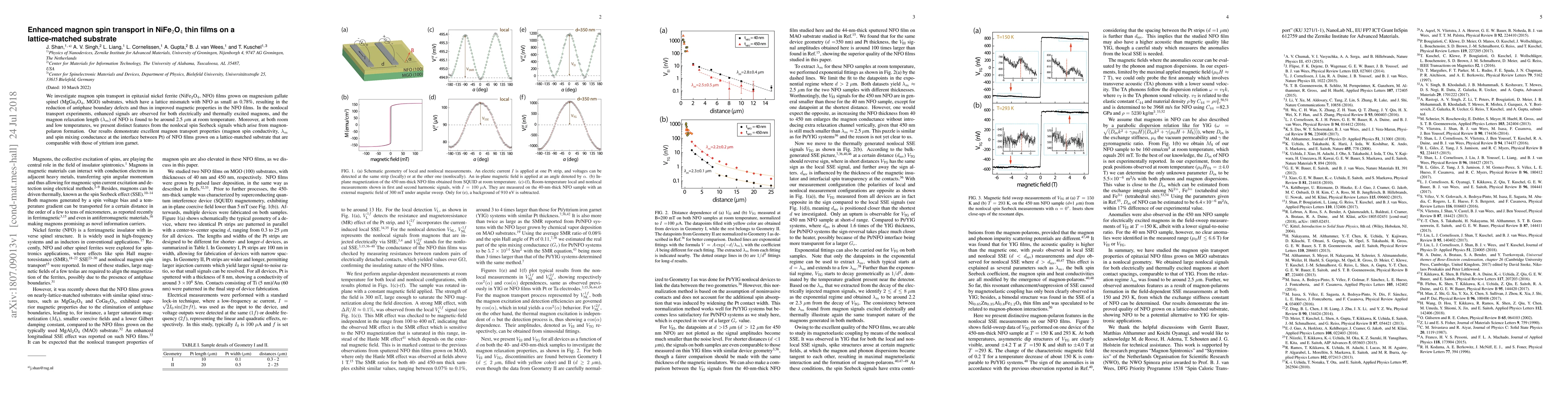 We investigate magnon spin transport in epitaxial nickel ferrite (NiFe$_2$O$_4$, NFO) films grown on magnesium gallate spinel (MgGa$_2$O$_4$, MGO) substrates, which have a lattice mismatch with NFO as small as 0.78%, resulting in the reduction of antiphase boundary defects and thus in improved magnetic properties in the NFO films. In the nonlocal transport experiments, enhanced signals are observed for both electrically and thermally excited magnons, and the magnon relaxation length ($\lambda_m$) of NFO is found to be around 2.5 $\mu$m at room temperature. Moreover, at both room and low temperatures, we present distinct features from the nonlocal spin Seebeck signals which arise from magnon polaron formation. Our results demonstrate excellent magnon transport properties (magnon spin conductivity, $\lambda_m$ and spin mixing conductance at the interface between Pt) of NFO films grown on a lattice-matched substrate that are comparable with those of yttrium iron garnet.