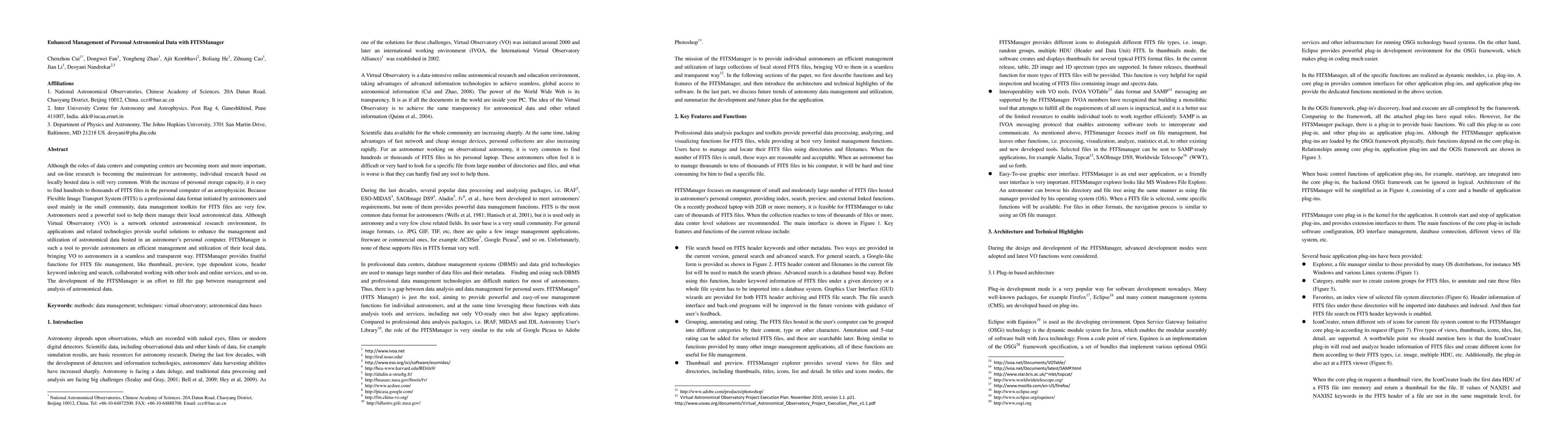 The research presents FITSManager, a tool developed using Eclipse and OSGi technology, with a plug-in based architecture for managing local astronomical data in FITS format.