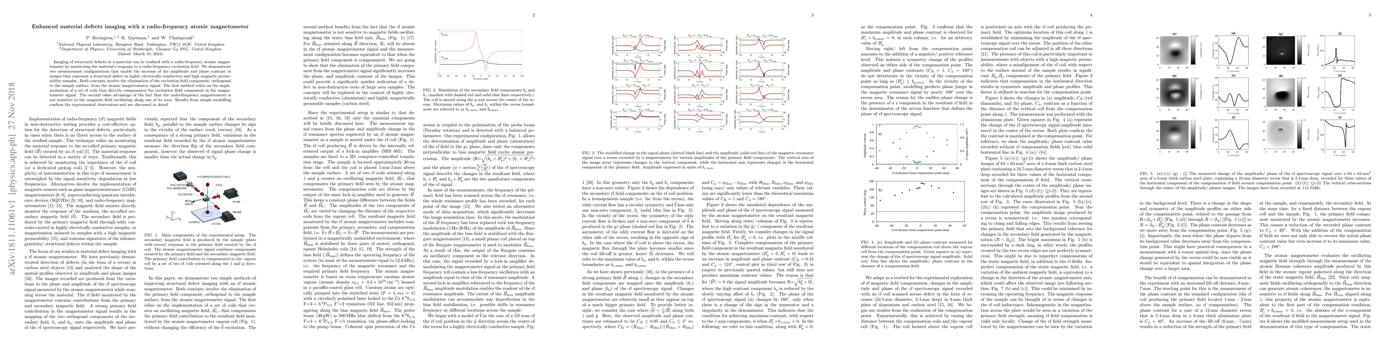 This paper presents enhanced imaging of material defects using a radio-frequency atomic magnetometer, achieving increased amplitude and phase contrast through two measurement configurations. Both methods eliminate unwanted excitation field components, with the first using compensating coils and the second exploiting the magnetometer's insensitivity to certain oscillating fields.