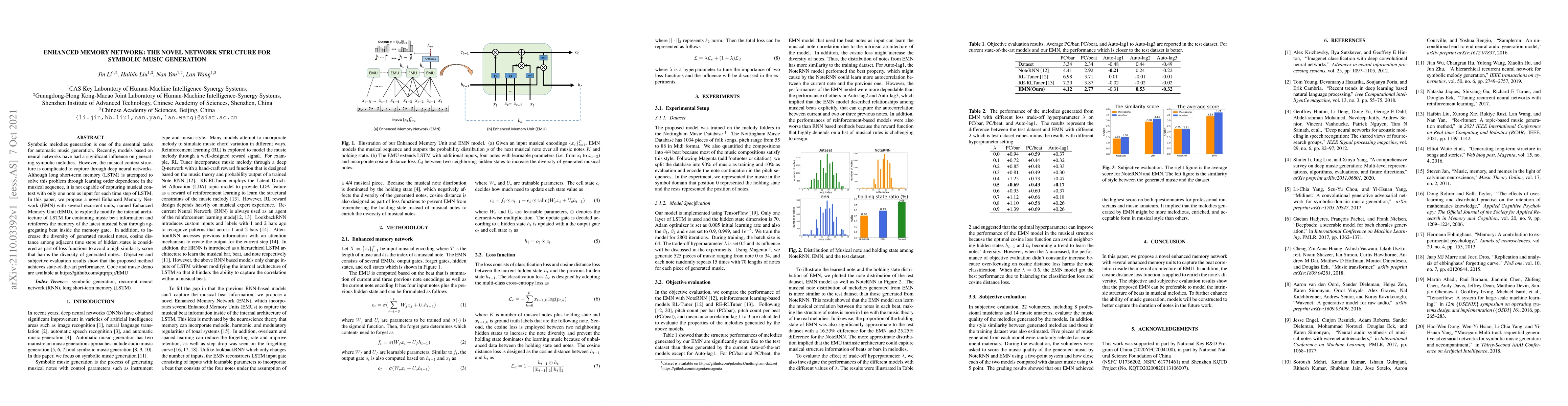 This paper introduces an Enhanced Memory Network (EMN) with Enhanced Memory Units (EMU) to improve symbolic music generation by capturing musical context better than LSTM. The EMN incorporates beat information and enhances memory retention, while a cosine distance loss function increases note diversity, achieving state-of-the-art results.
