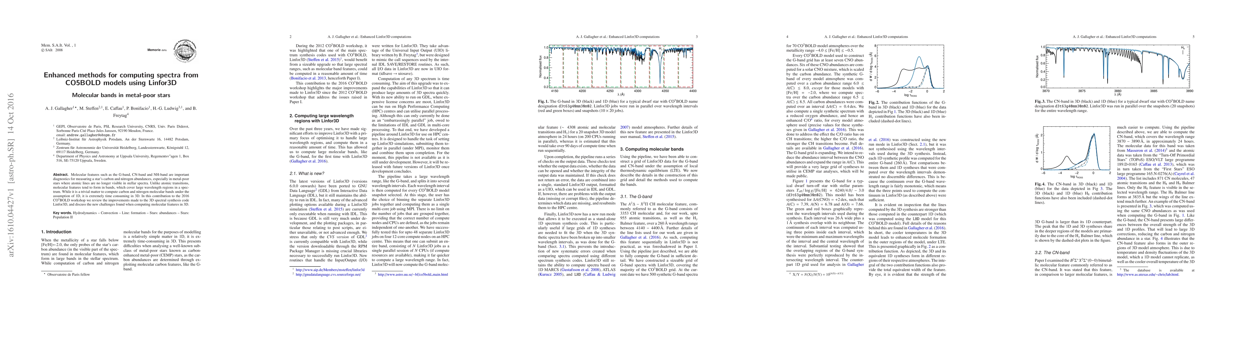 Molecular features such as the G-band, CN-band and NH-band are important diagnostics for measuring a star's carbon and nitrogen abundances, especially in metal-poor stars where atomic lines are no longer visible in stellar spectra. Unlike atomic transitions, molecular features tend to form in bands, which cover large wavelength regions in a spectrum. While it is a trivial matter to compute carbon and nitrogen molecular bands under the assumption of 1D, it is extremely time consuming in 3D. In this contribution to the 2016 CO5BOLD workshop we review the improvements made to the 3D spectral synthesis code Linfor3D, and discuss the new challenges found when computing molecular features in 3D.