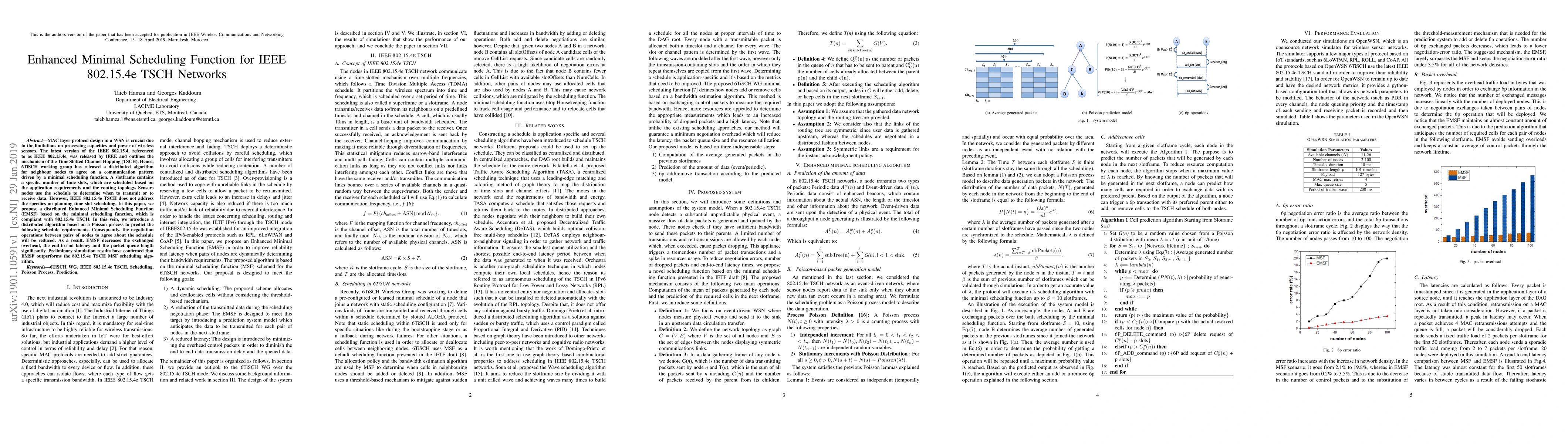 This paper proposes an Enhanced Minimal Scheduling Function (EMSF) for IEEE 802.15.4e TSCH networks to improve scheduling efficiency. EMSF uses a distributed algorithm based on a Poisson process to predict schedule requirements, reducing negotiation overhead and improving latency and packet queue length.