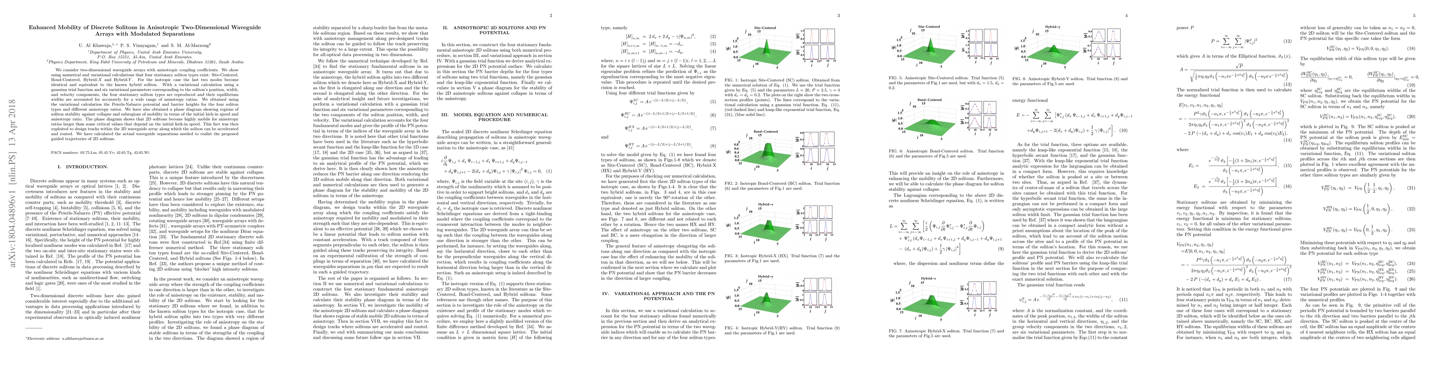 This research explores the enhanced mobility of solitons in anisotropic two-dimensional waveguide arrays, identifying four stationary soliton types and using variational calculations to reproduce their characteristics. The study reveals increased soliton mobility for larger anisotropy ratios, enabling the design of tracks for soliton acceleration and routing.