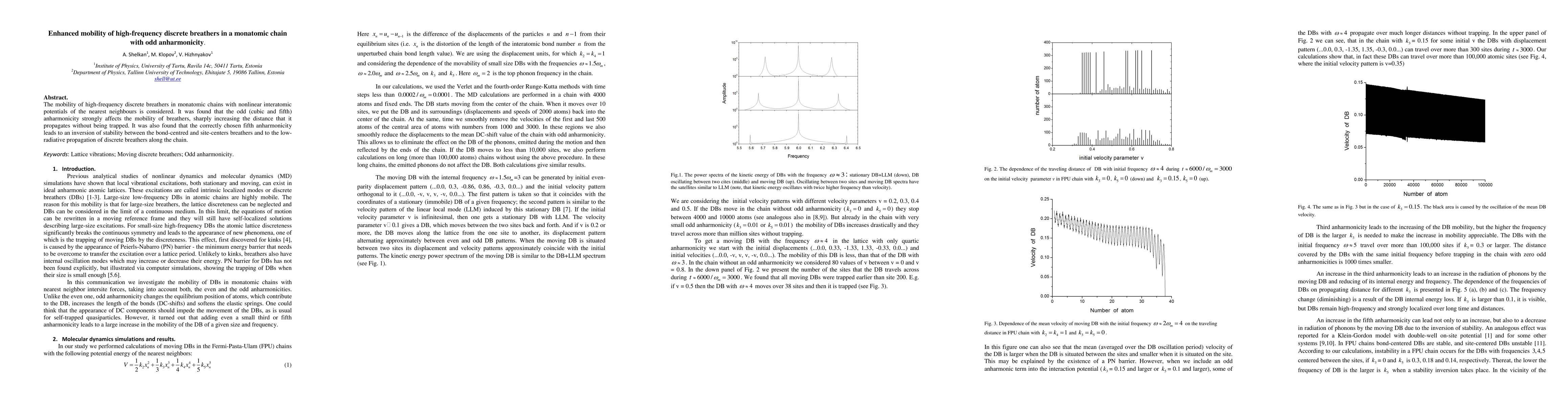Summary: This study investigates the enhanced mobility of high-frequency discrete breathers in monatomic chains with odd anharmonicity, revealing that cubic and fifth anharmonicities significantly increase breather propagation distance and can invert stability, enabling low-radiative propagation along the chain.