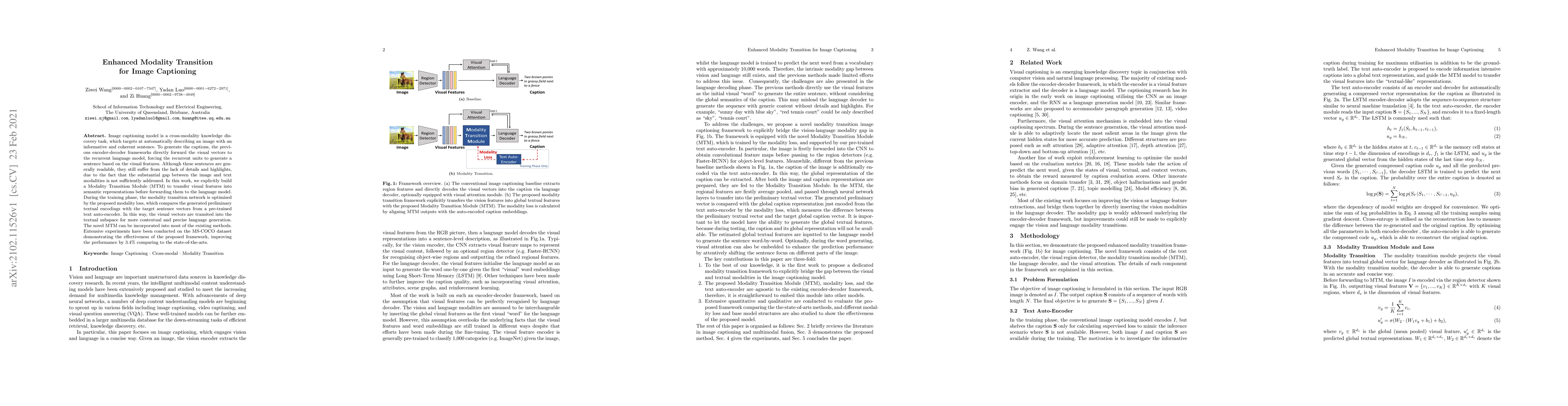 This paper proposes a Modality Transition Module to improve image captioning models by transitioning visual features into semantic representations before generating captions. The approach outperforms state-of-the-art methods by 3.4% on the MS-COCO dataset.
