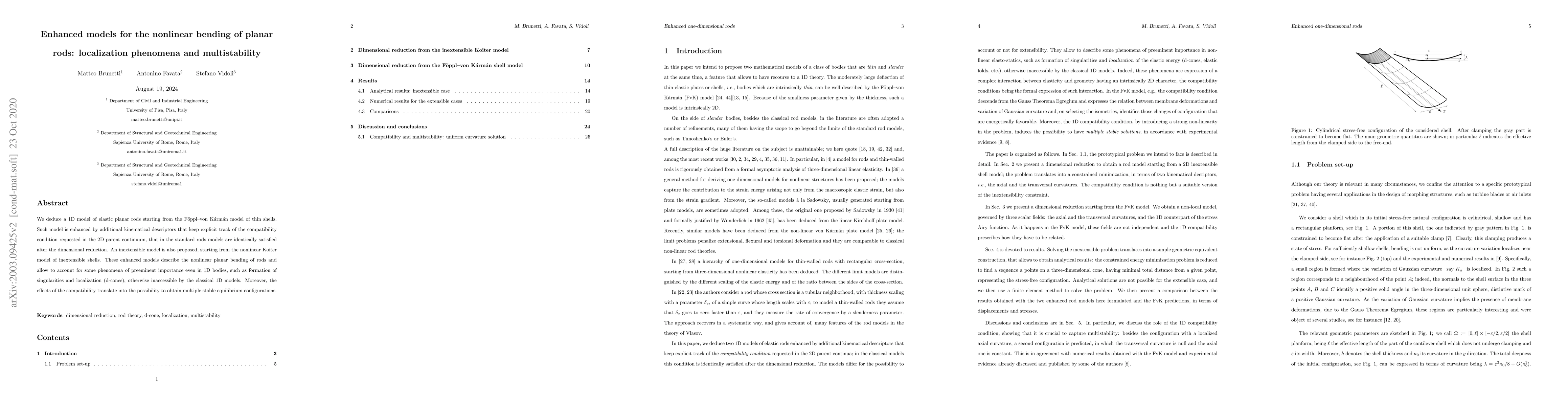 We deduce a 1D model of elastic planar rods starting from the F\"{o}ppl--von K\'{a}rm\'{a}n model of thin shells. Such model is enhanced by additional kinematical descriptors that keep explicit track of the compatibility condition requested in the 2D parent continuum, that in the standard rods models are identically satisfied after the dimensional reduction. An inextensible model is also proposed, starting from the nonlinear Koiter model of inextensible shells. These enhanced models describe the nonlinear planar bending of rods and allow to account for some phenomena of preeminent importance even in 1D bodies, such as formation of singularities and localization (d-cones), otherwise inaccessible by the classical 1D models. Moreover, the effects of the compatibility translate into the possibility to obtain multiple stable equilibrium configurations.
