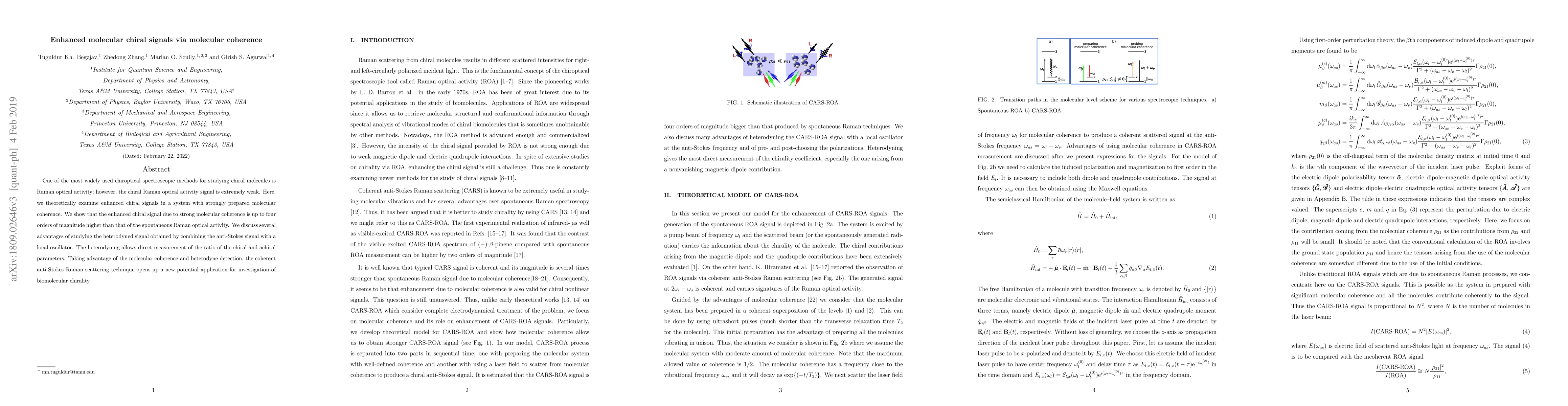 One of the most widely used chiroptical spectroscopic methods for studying chiral molecules is Raman optical activity; however, the chiral Raman optical activity signal is extremely weak. Here, we theoretically examine enhanced chiral signals in a system with strongly prepared molecular coherence. We show that the enhanced chiral signal due to strong molecular coherence is up to four orders of magnitude higher than that of the spontaneous Raman optical activity. We discuss several advantages of studying the heterodyned signal obtained by combining the anti-Stokes signal with a local oscillator. The heterodyning allows direct measurement of the ratio of the chiral and achiral parameters. Taking advantage of the molecular coherence and heterodyne detection, the coherent anti-Stokes Raman scattering technique opens up a new potential application for investigation of biomolecular chirality.