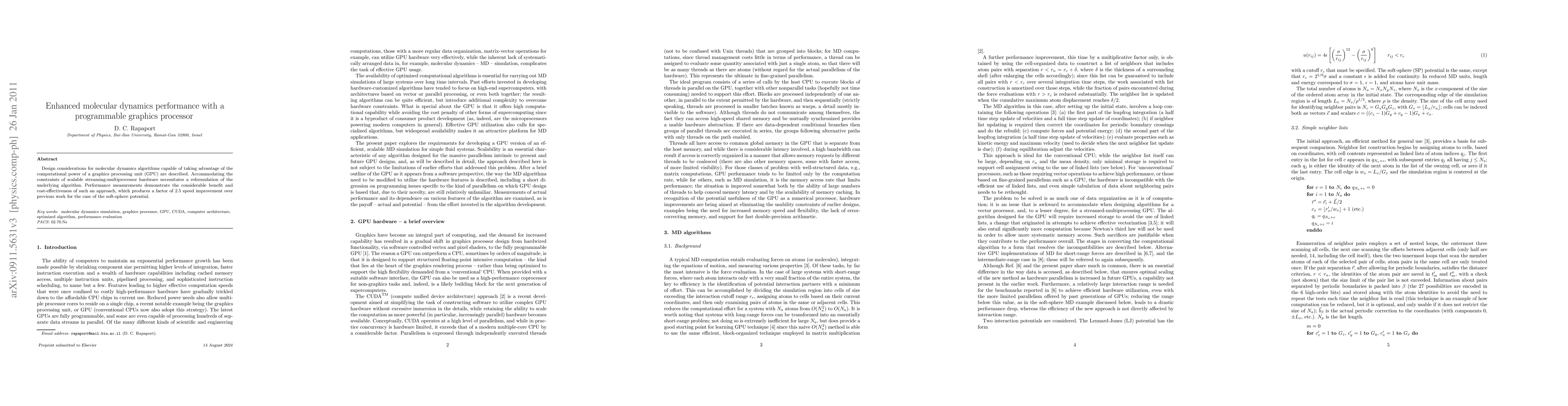 Design considerations for molecular dynamics algorithms capable of taking advantage of the computational power of a graphics processing unit (GPU) are described. Accommodating the constraints of scalable streaming-multiprocessor hardware necessitates a reformulation of the underlying algorithm. Performance measurements demonstrate the considerable benefit and cost-effectiveness of such an approach, which produces a factor of 2.5 speed improvement over previous work for the case of the soft-sphere potential.