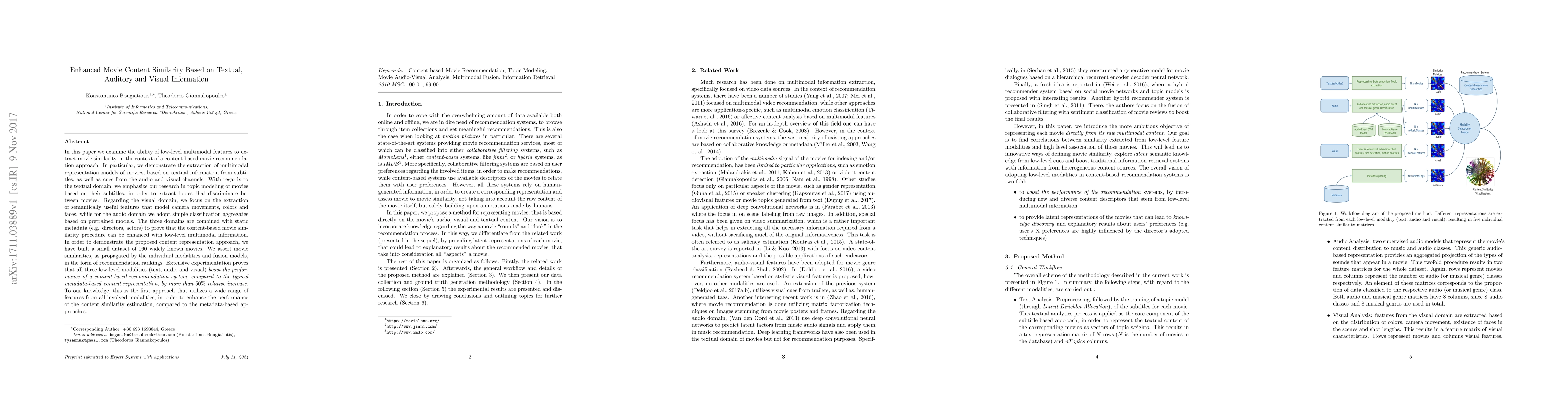 This paper explores the use of low-level multimodal features—textual from subtitles, audio, and visual—to enhance movie content similarity for recommendation systems. The study combines these features with static metadata to demonstrate a significant improvement in recommendation performance over traditional metadata-based approaches.
