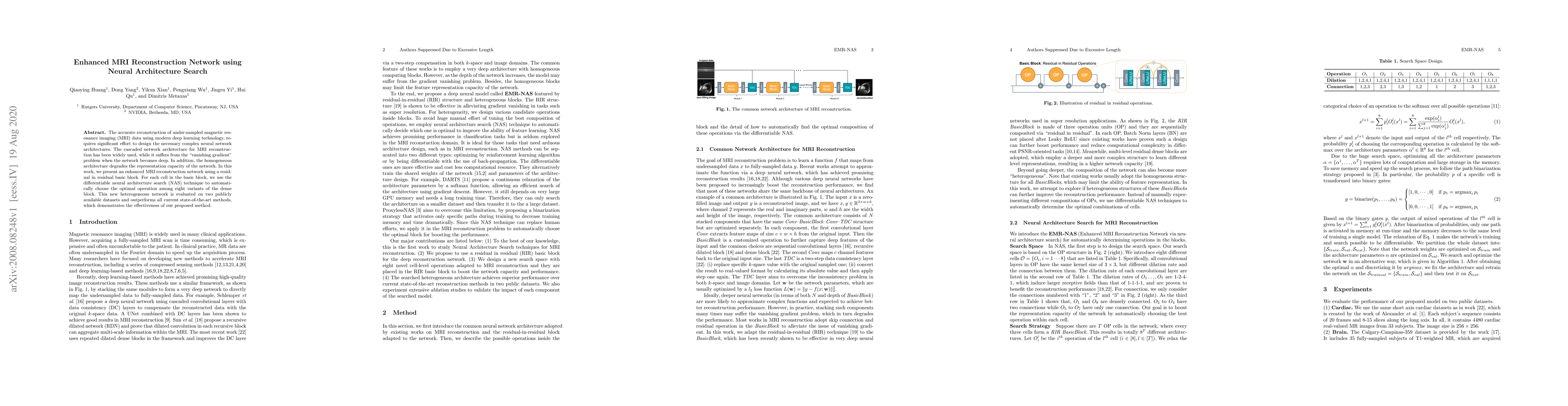 This paper proposes an enhanced MRI reconstruction network using a residual in residual basic block and differentiable neural architecture search to automatically select optimal operations. The resulting heterogeneous network outperforms current state-of-the-art methods on two datasets, addressing the "vanishing gradient" problem and enhancing representation capacity.