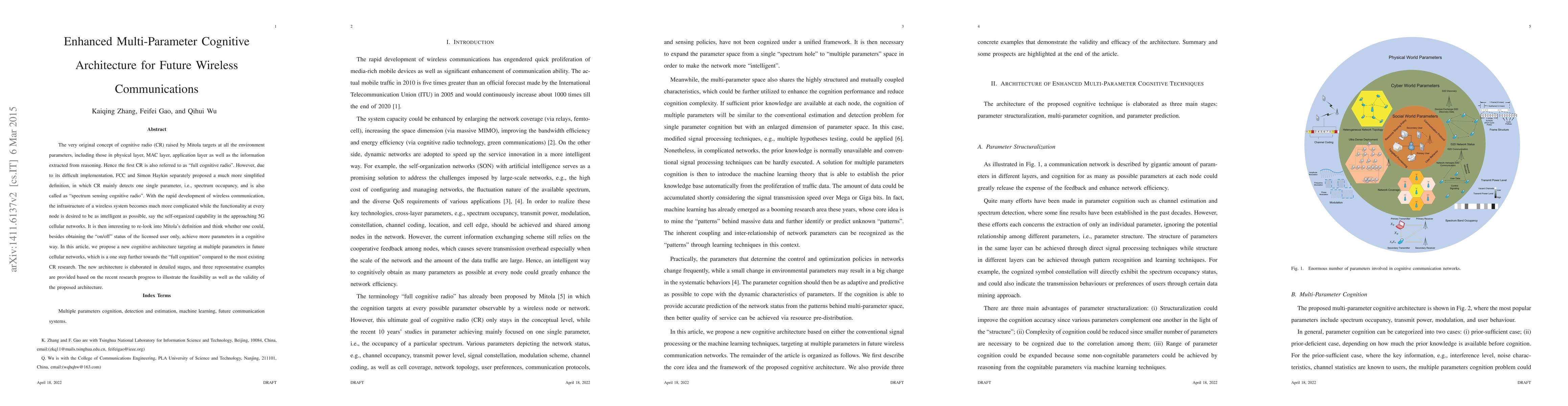 The very original concept of cognitive radio (CR) raised by Mitola targets at all the environment parameters, including those in physical layer, MAC layer, application layer as well as the information extracted from reasoning. Hence the first CR is also referred to as "full cognitive radio". However, due to its difficult implementation, FCC and Simon Haykin separately proposed a much more simplified definition, in which CR mainly detects one single parameter, i.e., spectrum occupancy, and is also called as "spectrum sensing cognitive radio". With the rapid development of wireless communication, the infrastructure of a wireless system becomes much more complicated while the functionality at every node is desired to be as intelligent as possible, say the self-organized capability in the approaching 5G cellular networks. It is then interesting to re-look into Mitola's definition and think whether one could, besides obtaining the "on/off" status of the licensed user only, achieve more parameters in a cognitive way. In this article, we propose a new cognitive architecture targeting at multiple parameters in future cellular networks, which is a one step further towards the "full cognition" compared to the most existing CR research. The new architecture is elaborated in detailed stages, and three representative examples are provided based on the recent research progress to illustrate the feasibility as well as the validity of the proposed architecture.