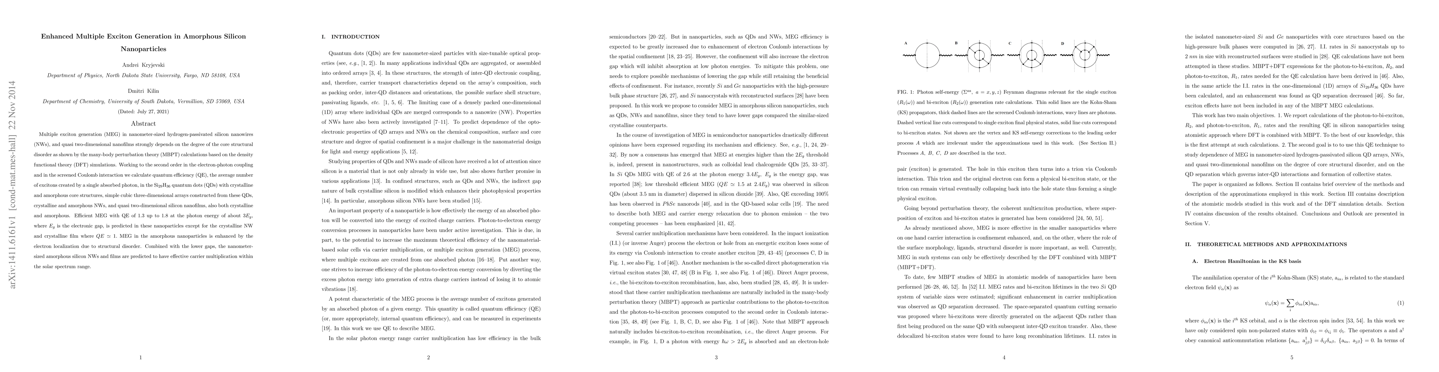 Multiple exciton generation (MEG) in nanometer-sized hydrogen-passivated silicon nanowires (NWs), and quasi two-dimensional nanofilms strongly depends on the degree of the core structural disorder as shown by the many-body perturbation theory (MBPT) calculations based on the density functional theory (DFT) simulations. Working to the second order in the electron-photon coupling and in the screened Coulomb interaction we calculate quantum efficiency (QE), the average number of excitons created by a single absorbed photon, in the ${\rm Si}_{29}{\rm H}_{36}$ quantum dots (QDs) with crystalline and amorphous core structures, simple cubic three-dimensional arrays constructed from these QDs, crystalline and amorphous NWs, and quasi two-dimensional silicon nanofilms, also both crystalline and amorphous. Efficient MEG with QE of 1.3 up to 1.8 at the photon energy of about $3E_g$, where $E_g$ is the electronic gap, is predicted in these nanoparticles except for the crystalline NW and crystalline film where $QE\simeq 1.$ MEG in the amorphous nanoparticles is enhanced by the electron localization due to structural disorder. Combined with the lower gaps, the nanometer-sized amorphous silicon NWs and films are predicted to have effective carrier multiplication within the solar spectrum range.