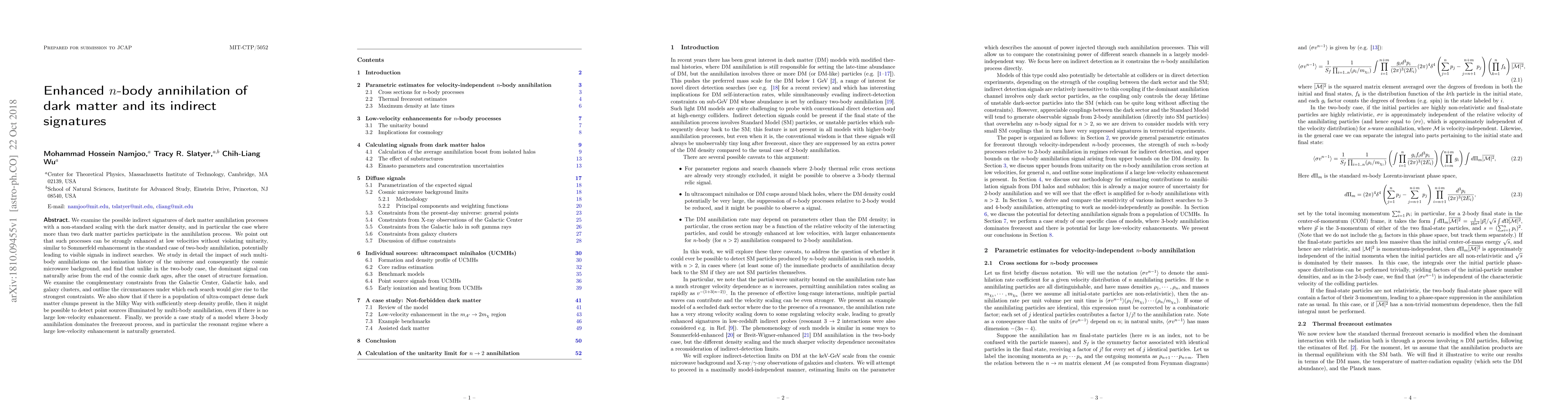 This paper explores enhanced n-body annihilation of dark matter, focusing on indirect signatures from multi-body processes that can lead to visible signals in cosmic microwave background and Galactic searches. It highlights scenarios where such processes could generate strong constraints and detectable point sources in dense dark matter clumps.