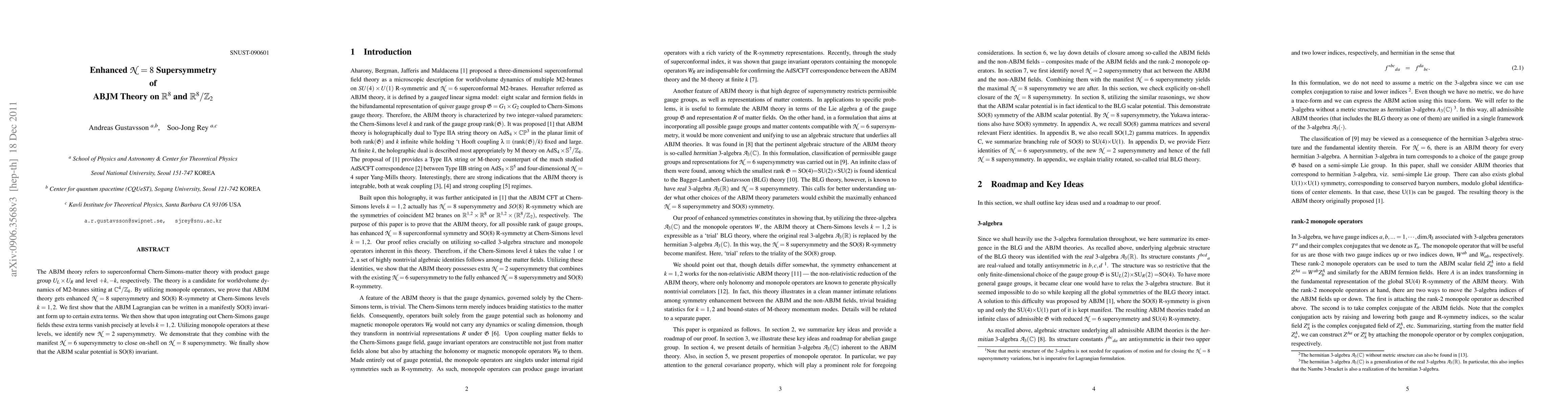This paper demonstrates the enhancement of N=8 supersymmetry in the ABJM theory at Chern-Simons levels k=1,2, showing that the theory exhibits SO(8) R-symmetry and utilizing monopole operators to achieve this enhanced symmetry. The ABJM Lagrangian is reformulated to be manifestly SO(8) invariant, and the integration of Chern-Simons fields confirms the vanishing of extra terms at these levels.