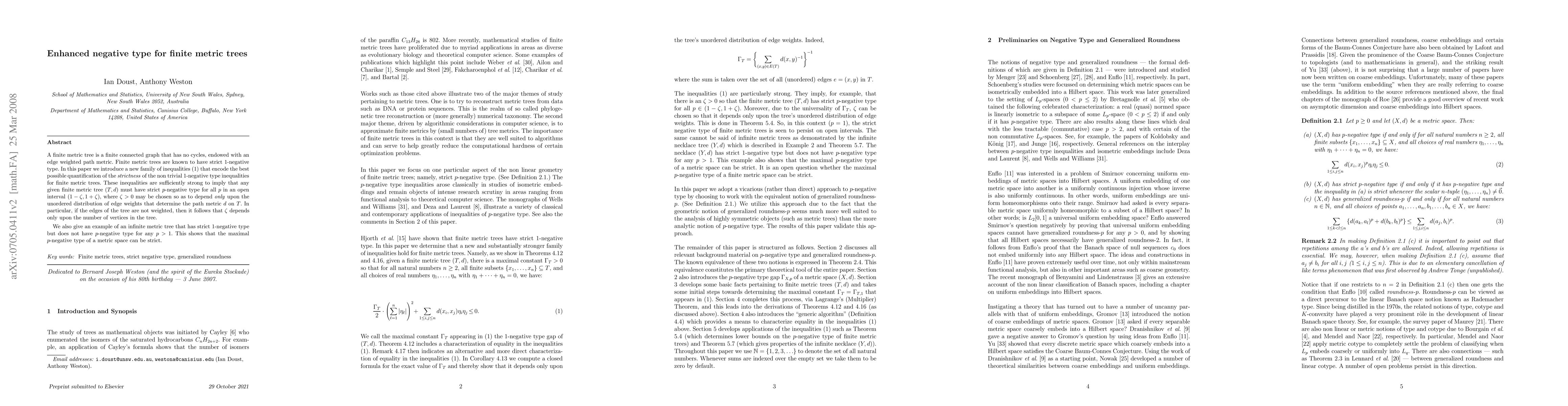 Finite metric trees are known to have strict 1-negative type. In this paper we introduce a new family of inequalities that quantify the extent of the "strictness" of the 1-negative type inequalities for finite metric trees. These inequalities of "enhanced 1-negative type" are sufficiently strong to imply that any given finite metric tree must have strict p-negative type for all values of p in an open interval that contains the number 1. Moreover, these open intervals can be characterized purely in terms of the unordered distribution of edge weights that determine the path metric on the particular tree, and are therefore largely independent of the tree's internal geometry. From these calculations we are able to extract a new non linear technique for improving lower bounds on the maximal p-negative type of certain finite metric spaces. Some pathological examples are also considered in order to stress certain technical points.