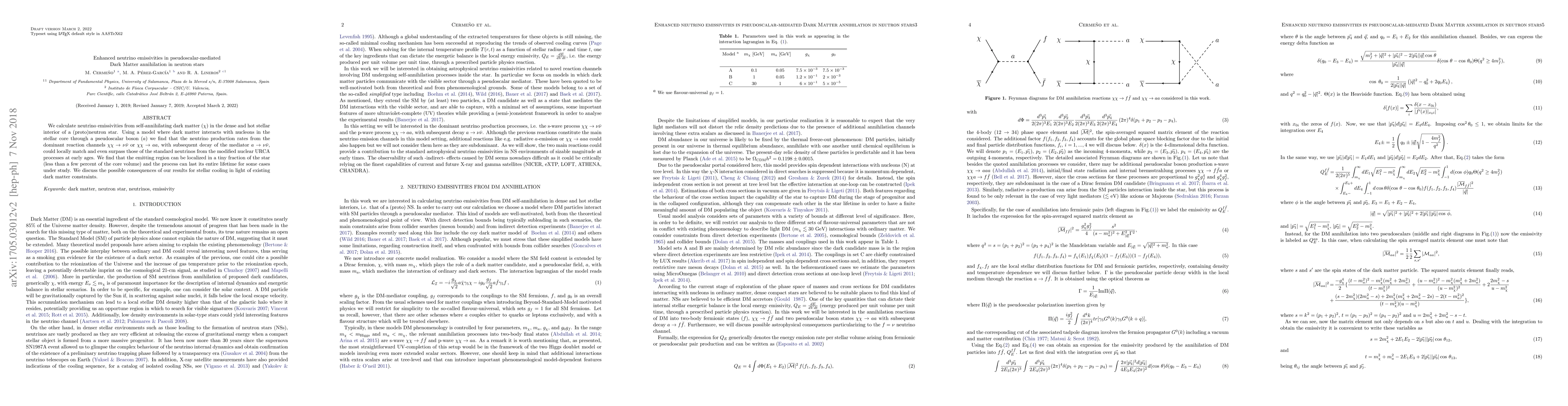 This paper explores neutrino emissivities from self-annihilating dark matter in neutron stars, finding that pseudoscalar-mediated annihilation can locally match or exceed standard neutrino production rates. The study highlights potential implications for neutron star cooling and the lifetime of emitting regions.
