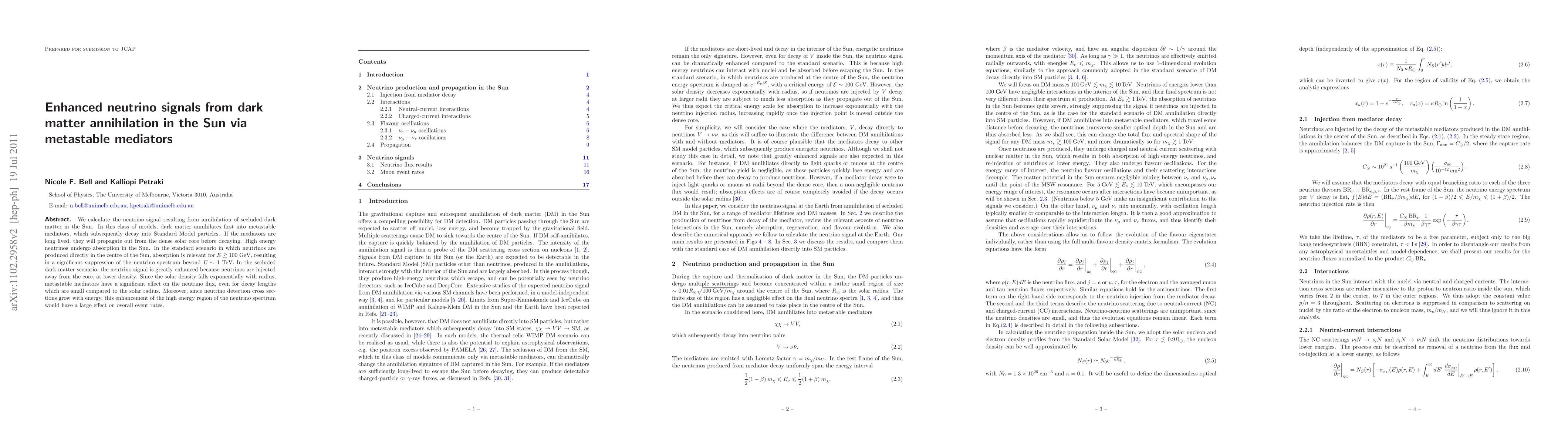 This paper investigates enhanced neutrino signals from dark matter annihilation in the Sun through metastable mediators, finding that these mediators, if long-lived, decay outside the Sun's core, significantly boosting high-energy neutrino flux and detection rates compared to direct central production scenarios.