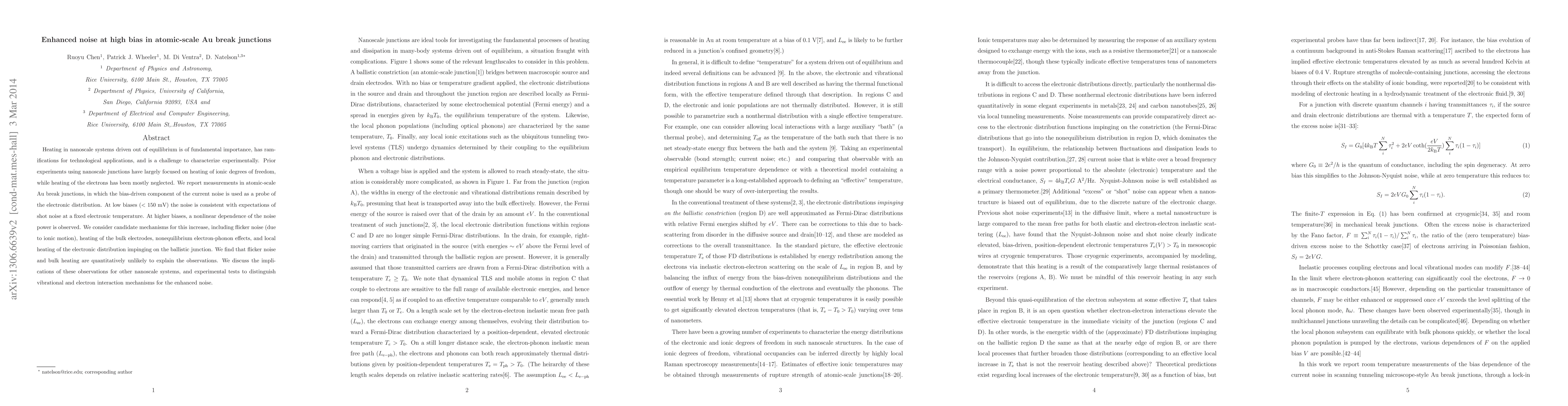 Heating in nanoscale systems driven out of equilibrium is of fundamental importance, has ramifications for technological applications, and is a challenge to characterize experimentally. Prior experiments using nanoscale junctions have largely focused on heating of ionic degrees of freedom, while heating of the electrons has been mostly neglected. We report measurements in atomic-scale Au break junctions, in which the bias-driven component of the current noise is used as a probe of the electronic distribution. At low biases ($<$ 150~mV) the noise is consistent with expectations of shot noise at a fixed electronic temperature. At higher biases, a nonlinear dependence of the noise power is observed. We consider candidate mechanisms for this increase, including flicker noise (due to ionic motion), heating of the bulk electrodes, nonequilibrium electron-phonon effects, and local heating of the electronic distribution impinging on the ballistic junction. We find that flicker noise and bulk heating are quantitatively unlikely to explain the observations. We discuss the implications of these observations for other nanoscale systems, and experimental tests to distinguish vibrational and electron interaction mechanisms for the enhanced noise.