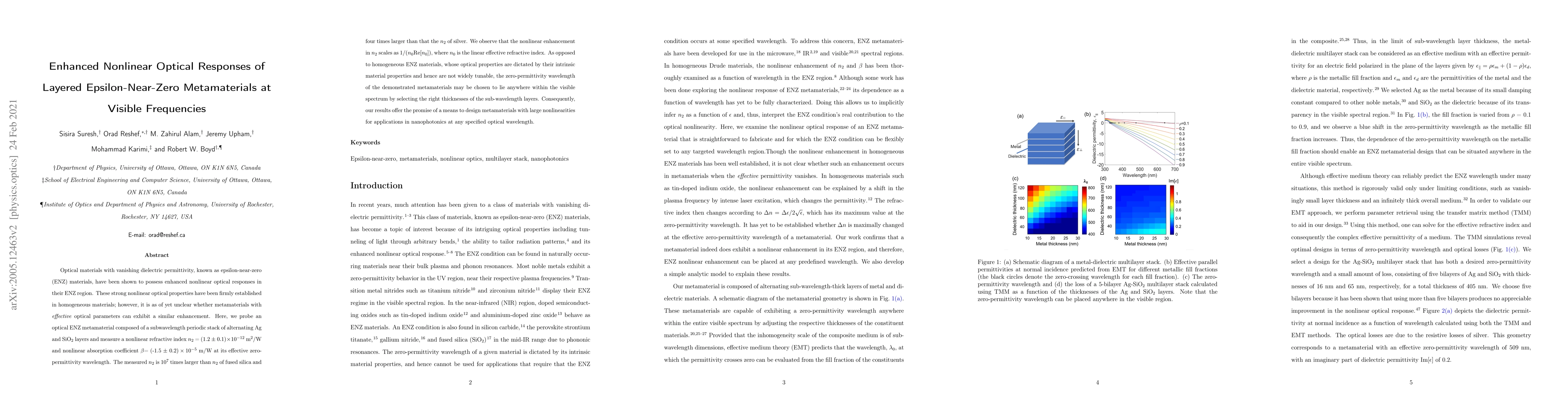 This paper investigates layered epsilon-near-zero (ENZ) metamaterials composed of alternating Ag and SiO$_2$ layers, revealing significantly enhanced nonlinear optical responses at visible frequencies. The metamaterials exhibit a nonlinear refractive index $n_2$ that is $10^7$ times larger than that of fused silica, demonstrating tunable nonlinear optical properties across the visible spectrum.
