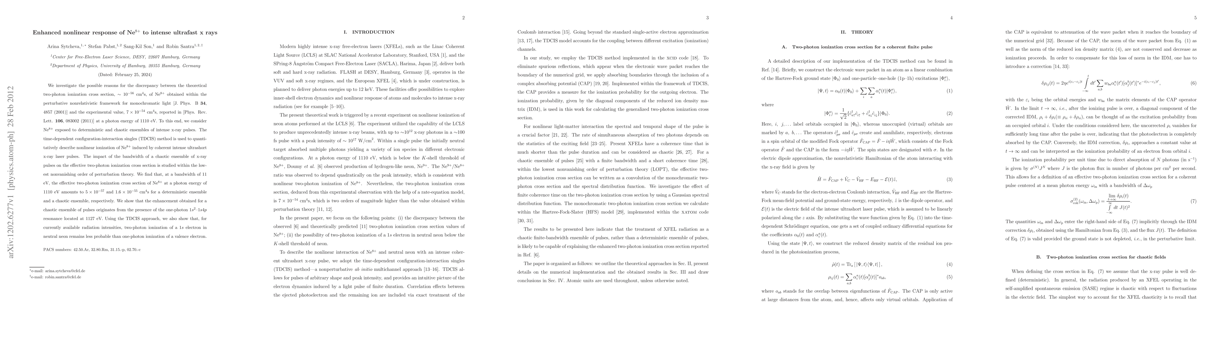 We investigate the possible reasons for the discrepancy between the theoretical two-photon ionization cross section, $\sim 10^{-56}$ $\text{cm}^4 \text{s}$, of Ne$^{8+}$ obtained within the perturbative nonrelativistic framework for monochromatic light [J. Phys. B {\bf 34}, 4857 (2001)] and the experimental value, $7 \times 10^{-54}$ $\text{cm}^4 \text{s}$, reported in [Phys. Rev. Lett. {\bf 106}, 083002 (2011)] at a photon energy of 1110 eV. To this end, we consider Ne$^{8+}$ exposed to deterministic and chaotic ensembles of intense x-ray pulses. The time-dependent configuration-interaction singles (TDCIS) method is used to quantitatively describe nonlinear ionization of Ne$^{8+}$ induced by coherent intense ultrashort x-ray laser pulses. The impact of the bandwidth of a chaotic ensemble of x-ray pulses on the effective two-photon ionization cross section is studied within the lowest nonvanishing order of perturbation theory. We find that, at a bandwidth of 11 eV, the effective two-photon ionization cross section of Ne$^{8+}$ at a photon energy of 1110 eV amounts to $5 \times 10^{-57}$ and $1.6 \times 10^{-55}$ $\text{cm}^4 \text{s}$ for a deterministic ensemble and a chaotic ensemble, respectively. We show that the enhancement obtained for a chaotic ensemble of pulses originates from the presence of the one-photon 1$s^2$--1$s4p$ resonance located at 1127 eV. Using the TDCIS approach, we also show that, for currently available radiation intensities, two-photon ionization of a 1$s$ electron in neutral neon remains less probable than one-photon ionization of a valence electron.