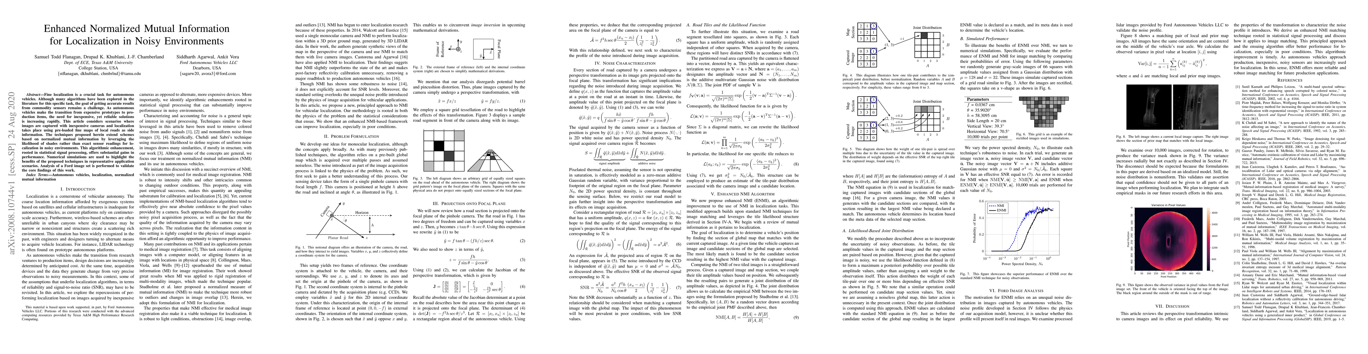 This paper proposes enhanced normalized mutual information techniques for localization in noisy environments, leveraging the likelihood of shades instead of exact sensor readings for improved accuracy in autonomous vehicle navigation using inexpensive cameras. The new approach, validated through simulations and Ford image set analysis, demonstrates significant performance gains.
