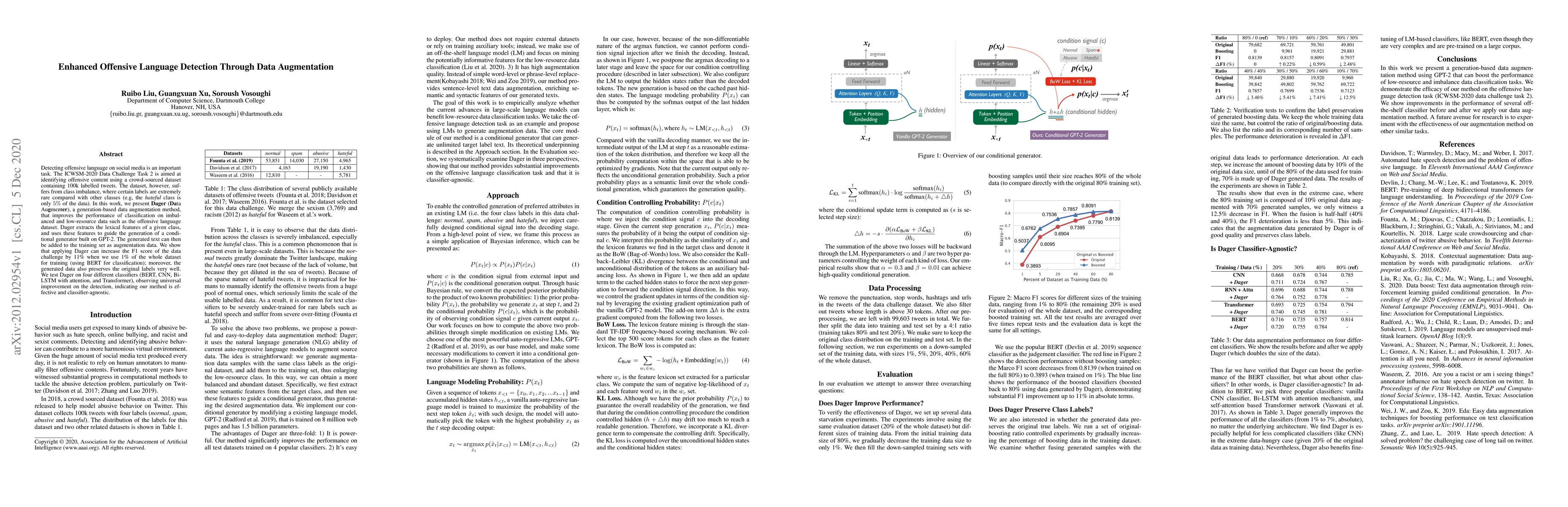 Detecting offensive language on social media is an important task. The ICWSM-2020 Data Challenge Task 2 is aimed at identifying offensive content using a crowd-sourced dataset containing 100k labelled tweets. The dataset, however, suffers from class imbalance, where certain labels are extremely rare compared with other classes (e.g, the hateful class is only 5% of the data). In this work, we present Dager (Data Augmenter), a generation-based data augmentation method, that improves the performance of classification on imbalanced and low-resource data such as the offensive language dataset. Dager extracts the lexical features of a given class, and uses these features to guide the generation of a conditional generator built on GPT-2. The generated text can then be added to the training set as augmentation data. We show that applying Dager can increase the F1 score of the data challenge by 11% when we use 1% of the whole dataset for training (using BERT for classification); moreover, the generated data also preserves the original labels very well. We test Dager on four different classifiers (BERT, CNN, Bi-LSTM with attention, and Transformer), observing universal improvement on the detection, indicating our method is effective and classifier-agnostic.