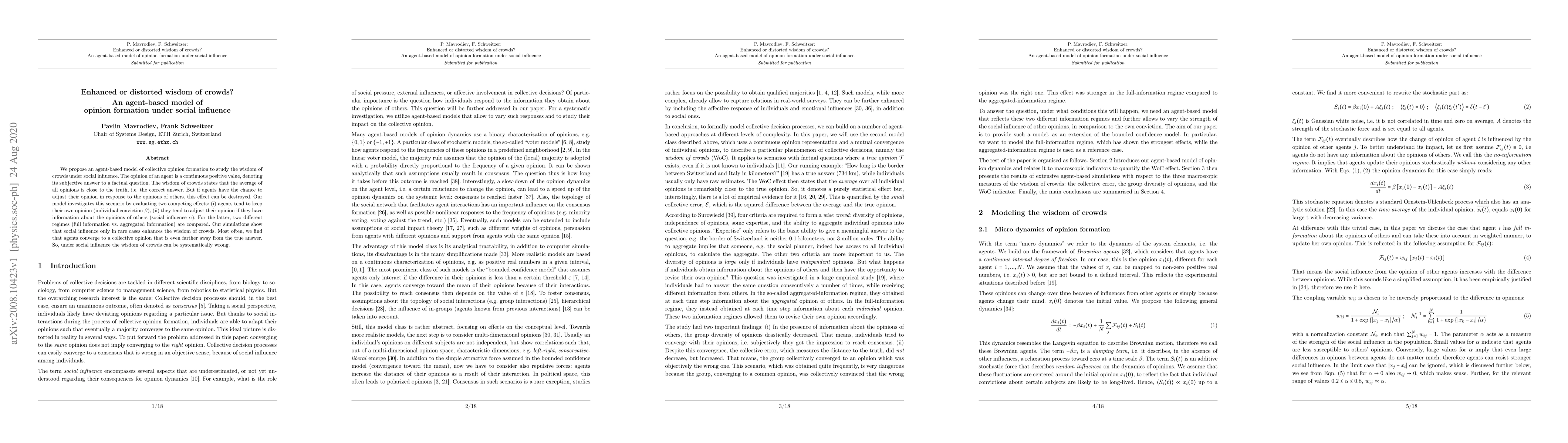 This paper proposes an agent-based model to study collective opinion formation under social influence, finding that while the wisdom of crowds typically holds, social influence often distorts this effect, leading to collective opinions that are farther from the true answer. The model evaluates individual conviction and social influence, showing that social influence rarely enhances but often distorts crowd wisdom.
