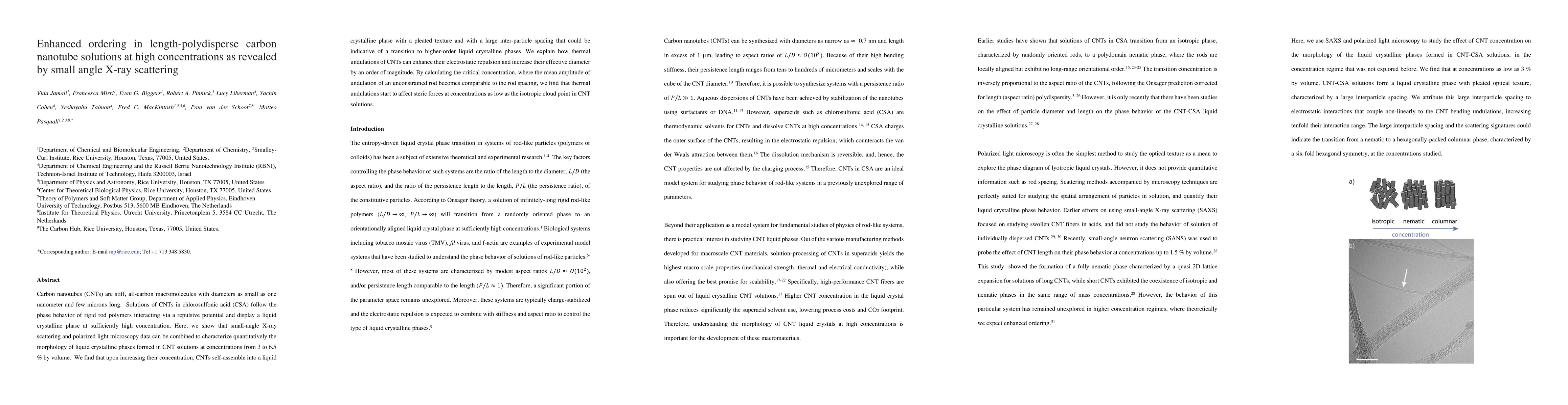 Carbon nanotubes (CNTs) are stiff, all-carbon macromolecules with diameters as small as one nanometer and few microns long. Solutions of CNTs in chlorosulfonic acid (CSA) follow the phase behavior of rigid rod polymers interacting via a repulsive potential and display a liquid crystalline phase at sufficiently high concentration. Here, we show that small-angle X-ray scattering and polarized light microscopy data can be combined to characterize quantitatively the morphology of liquid crystalline phases formed in CNT solutions at concentrations from 3 to 6.5 % by volume. We find that upon increasing their concentration, CNTs self-assemble into a liquid crystalline phase with a pleated texture and with a large inter-particle spacing that could be indicative of a transition to higher-order liquid crystalline phases. We explain how thermal undulations of CNTs can enhance their electrostatic repulsion and increase their effective diameter by an order of magnitude. By calculating the critical concentration, where the mean amplitude of undulation of an unconstrained rod becomes comparable to the rod spacing, we find that thermal undulations start to affect steric forces at concentrations as low as the isotropic cloud point in CNT solutions.