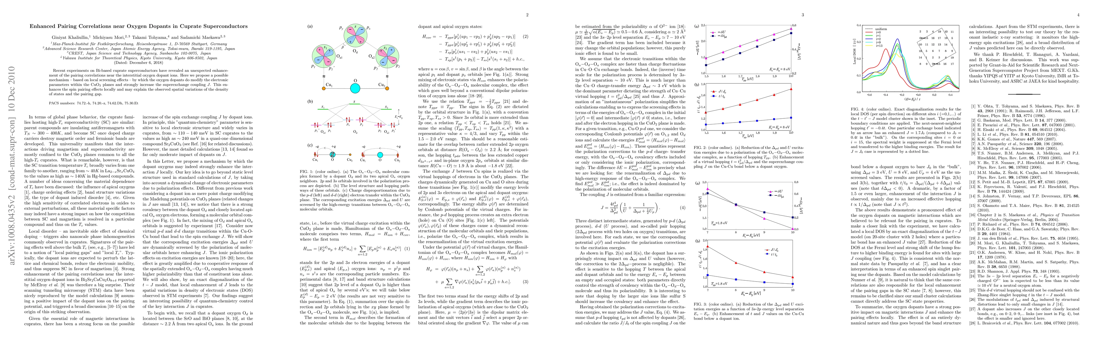 Summary: Recent experiments show enhanced pairing correlations near interstitial oxygen dopants in Bi-based cuprate superconductors. Proposed mechanism involves local screening effects modifying electronic parameters and increasing superexchange coupling J, enhancing local spin pairing and explaining spatial variations in density of states and pairing gap.