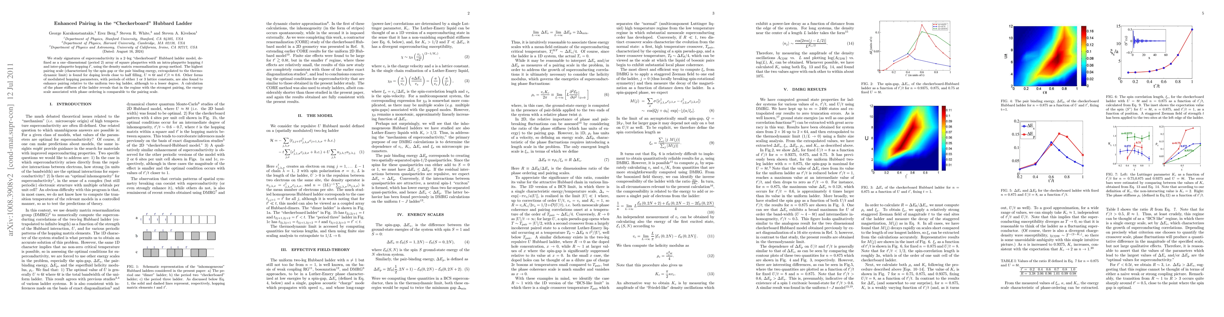 We study signatures of superconductivity in a 2--leg "checkerboard" Hubbard ladder model, defined as a one--dimensional (period 2) array of square plaquettes with an intra-plaquette hopping $t$ and inter-plaquette hopping $t'$, using the density matrix renormalization group method. The highest pairing scale (characterized by the spin gap or the pair binding energy, extrapolated to the thermodynamic limit) is found for doping levels close to half filling, $U\approx 6t$ and $t'/t \approx 0.6$. Other forms of modulated hopping parameters, with periods of either 1 or 3 lattice constants, are also found to enhance pairing relative to the uniform two--leg ladder, although to a lesser degree. A calculation of the phase stiffness of the ladder reveals that in the regime with the strongest pairing, the energy scale associated with phase ordering is comparable to the pairing scale.