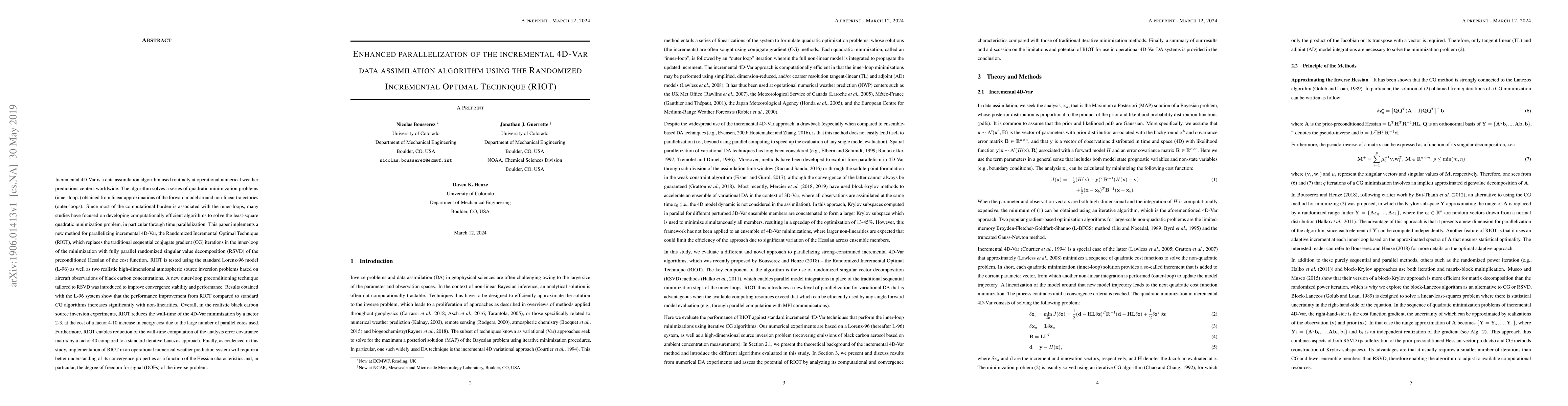 This paper introduces the Randomized Incremental Optimal Technique (RIOT) to parallelize the incremental 4D-Var data assimilation algorithm, replacing sequential conjugate gradient iterations with parallel randomized singular value decomposition. RIOT significantly reduces wall-time in high-dimensional atmospheric inversion problems, though it increases energy costs due to parallel processing.