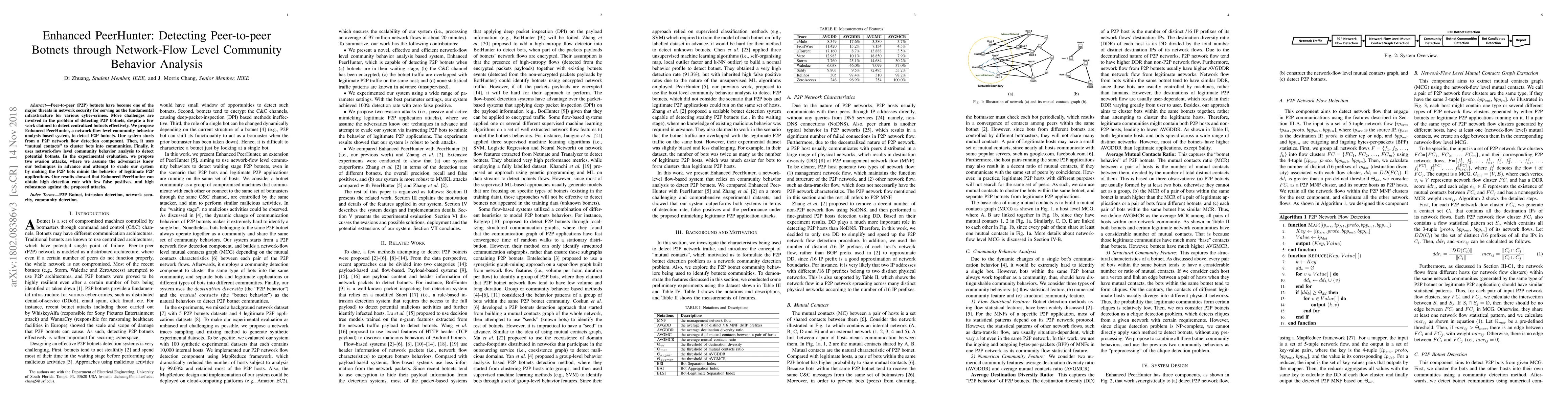 Enhanced PeerHunter employs network-flow level community behavior analysis to detect P2P botnets by clustering bots into communities based on mutual contacts and identifying anomalous behavior patterns. Despite simulated evasion attacks, the system maintains high detection rates and robustness.